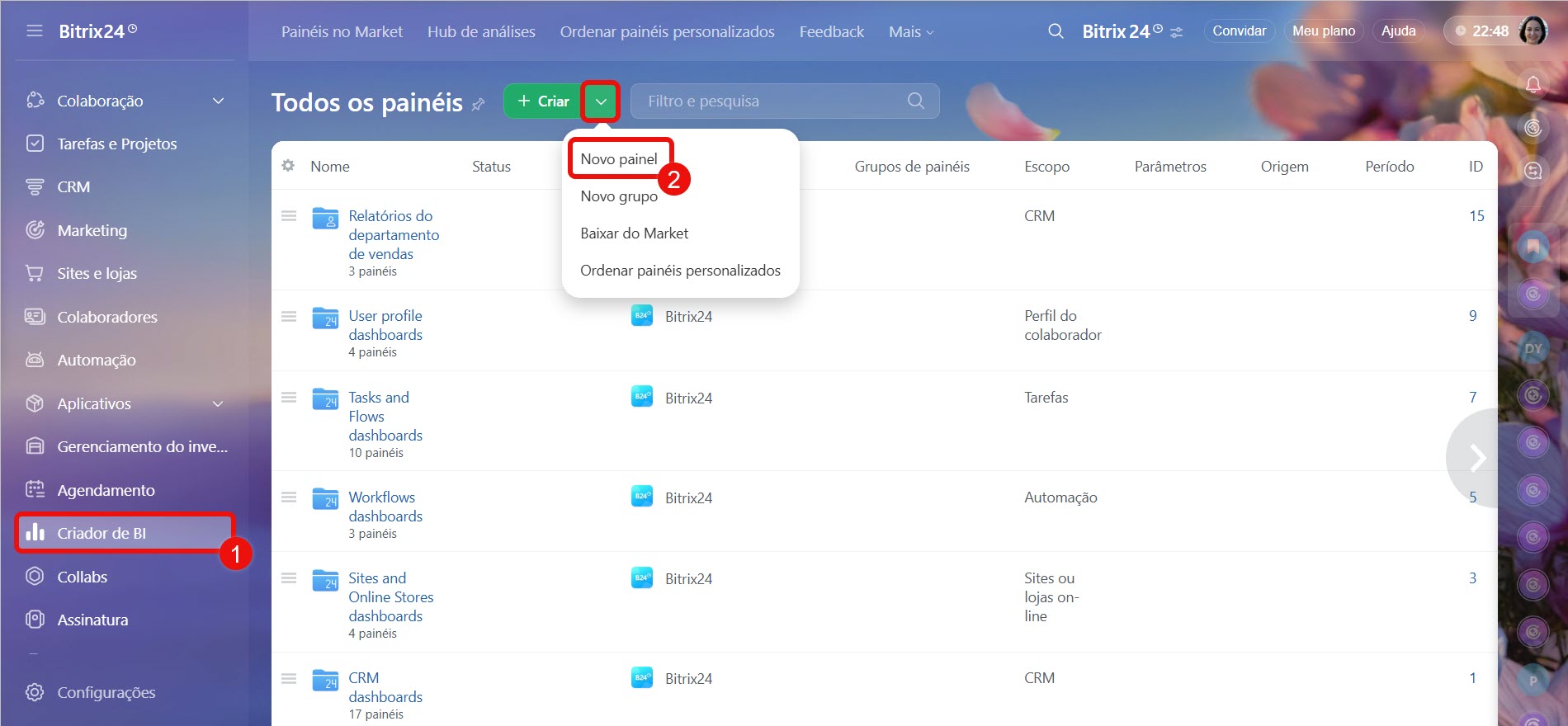 2-3. Para criar um relatório, clique em Criar > Novo painel.