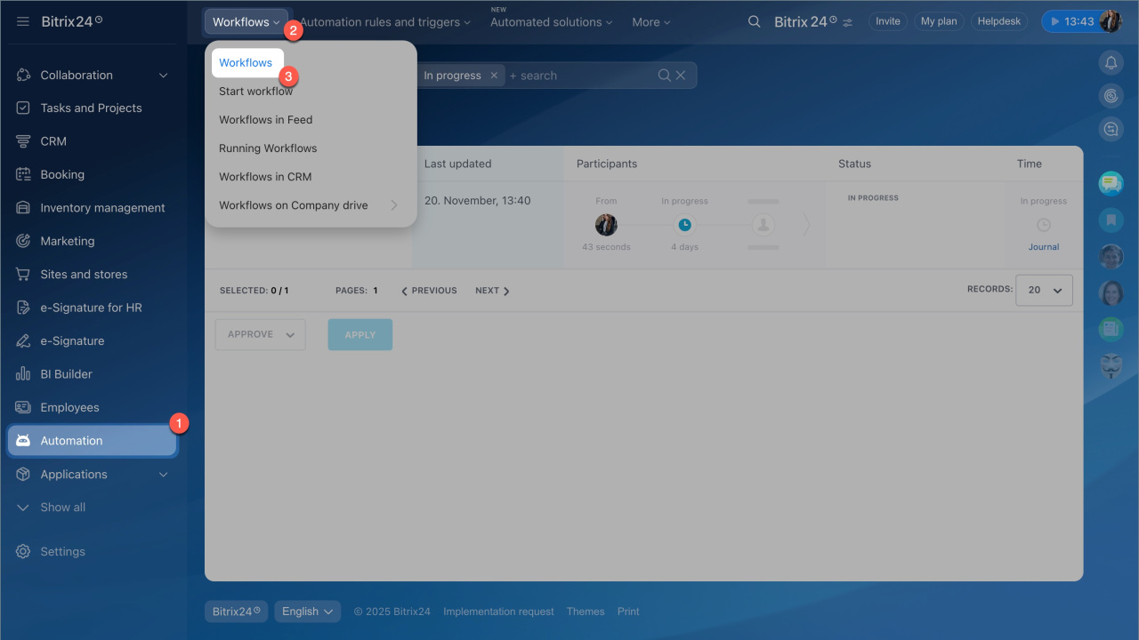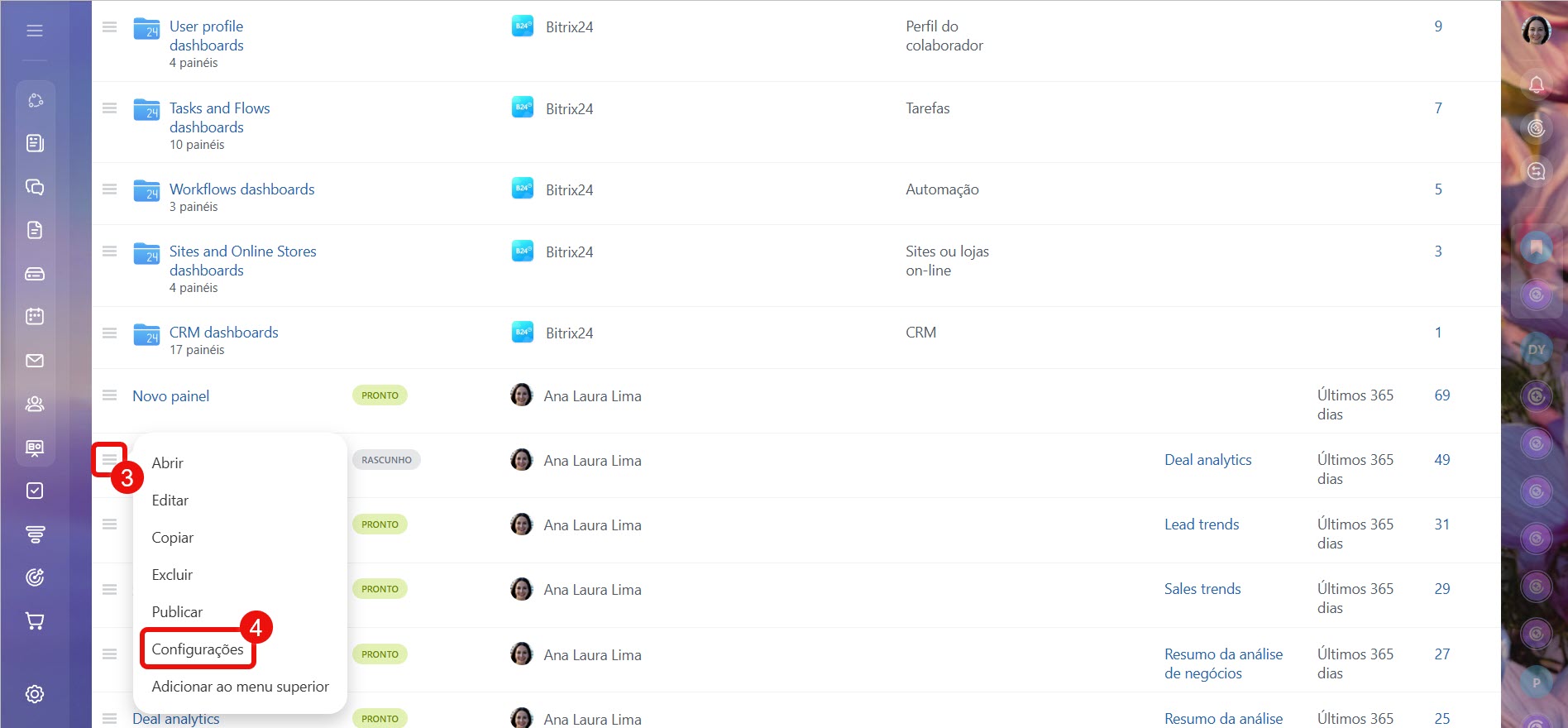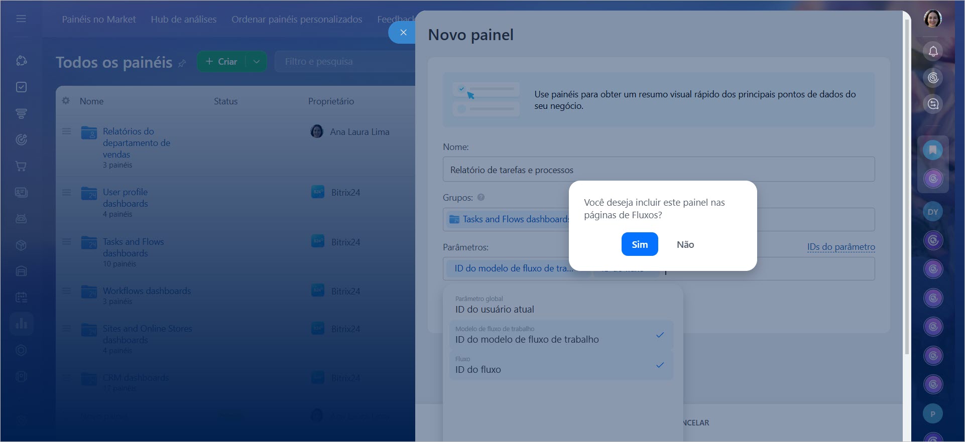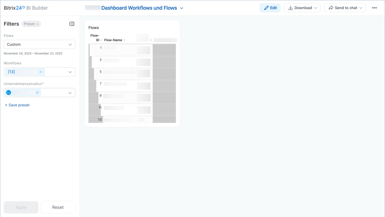 - Depois, adicione os filtros ao relatório, abra-o no Bitrix24 e verifique se ele exibe dados apenas do fluxo ou processo selecionado.