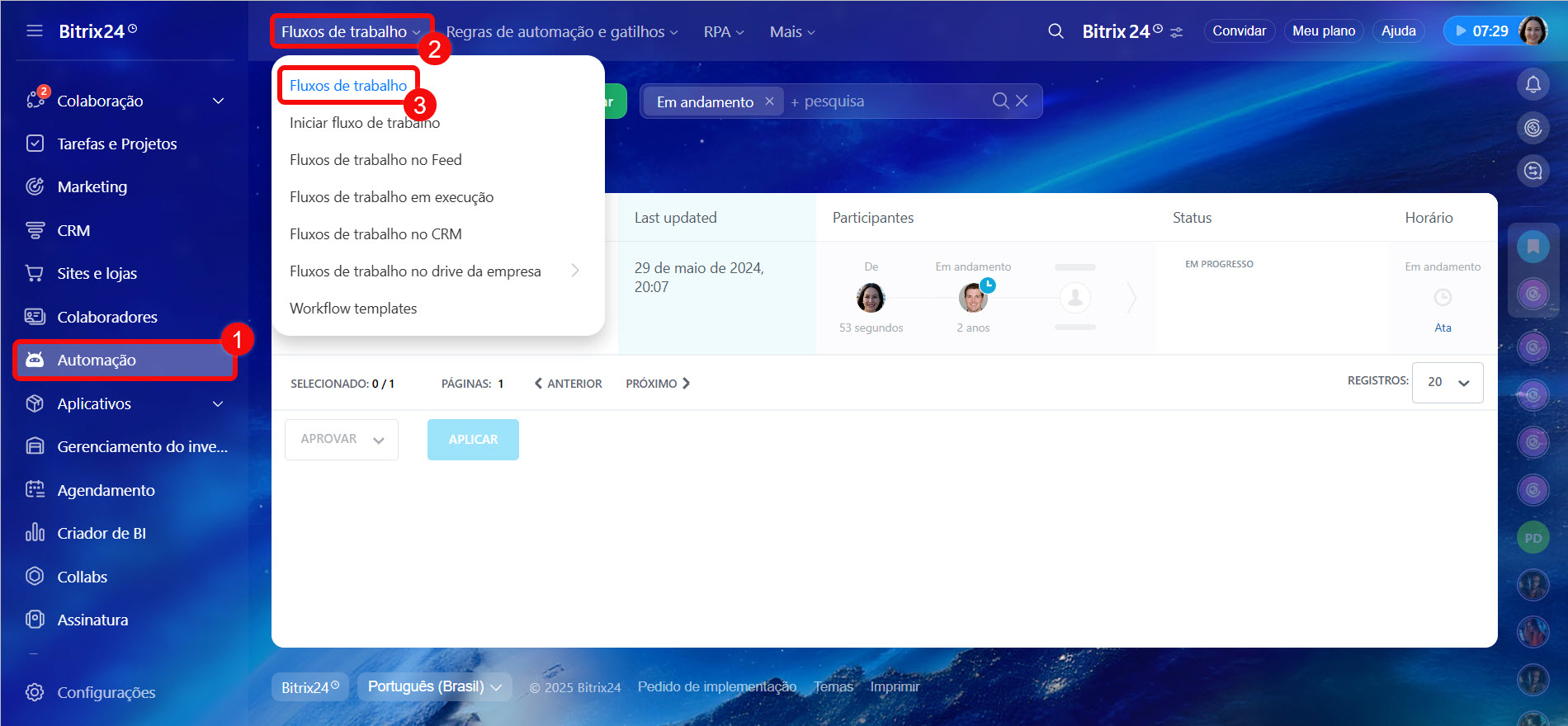 A seguir, é apresentada uma consulta SQL para extrair dados de três tabelas: atribuições de fluxos de trabalho (bizproc_task), fluxos de trabalho iniciados (bizproc_workflow_state) e modelos de fluxos de trabalho (bizproc_workflow_template). Você pode copiá-la e testar seu funcionamento. A consulta exibe informações-chave sobre os fluxos de trabalho iniciados e permite filtragem pelo parâmetro workflow_template_id, o que possibilita gerar relatórios para um modelo específico.