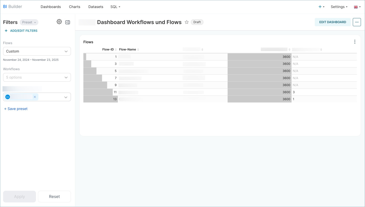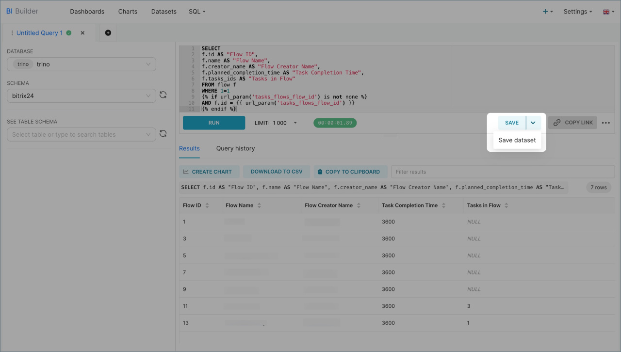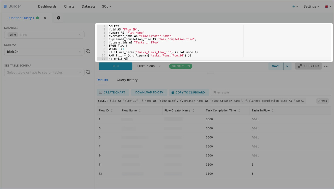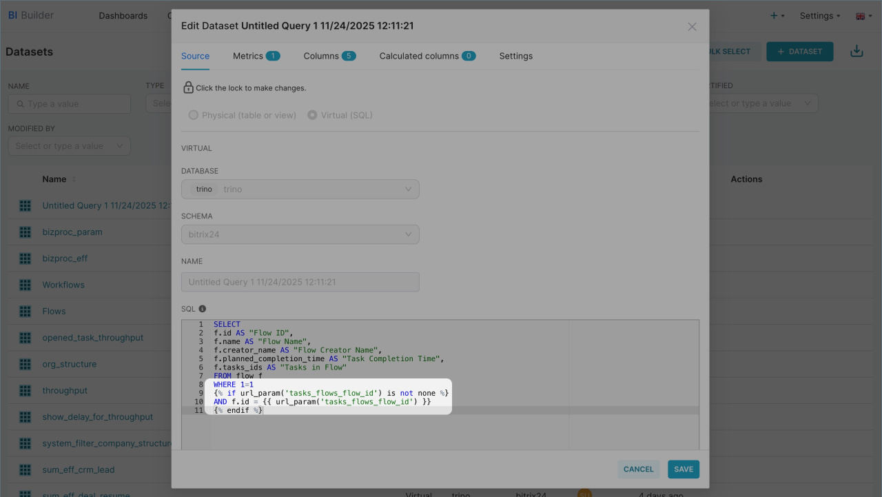 É utilizado um template Jinja que verifica se o relatório inclui o parâmetro tasks_flows_flow_id. Se o relatório for aberto a partir de um fluxo, o Jinja insere seu identificador e exibe apenas os dados desse fluxo. Se for aberto diretamente no Criador de BI, o parâmetro não é transmitido e todos os dados são exibidos.