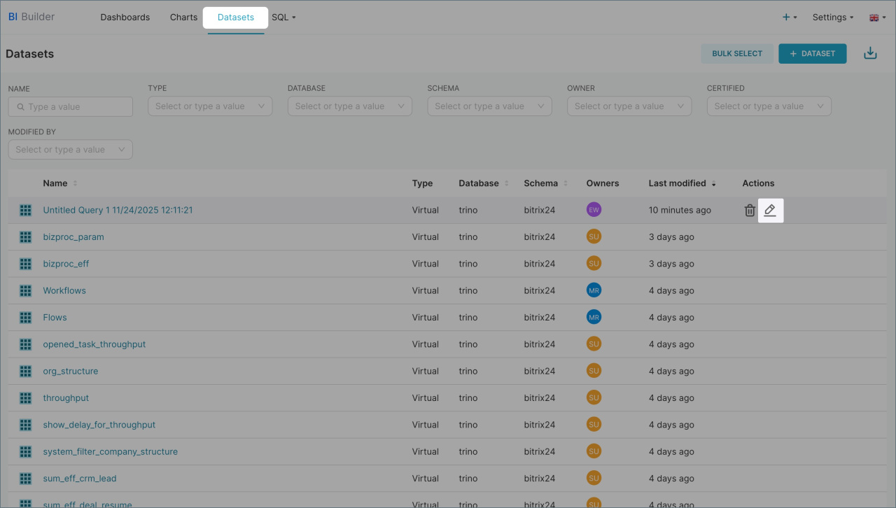 Se você já tiver um relatório existente, pode editar o conjunto de dados e adicionar o parâmetro necessário. Para isso, abra a aba Datasets, selecione o conjunto de dados e clique em Editar.