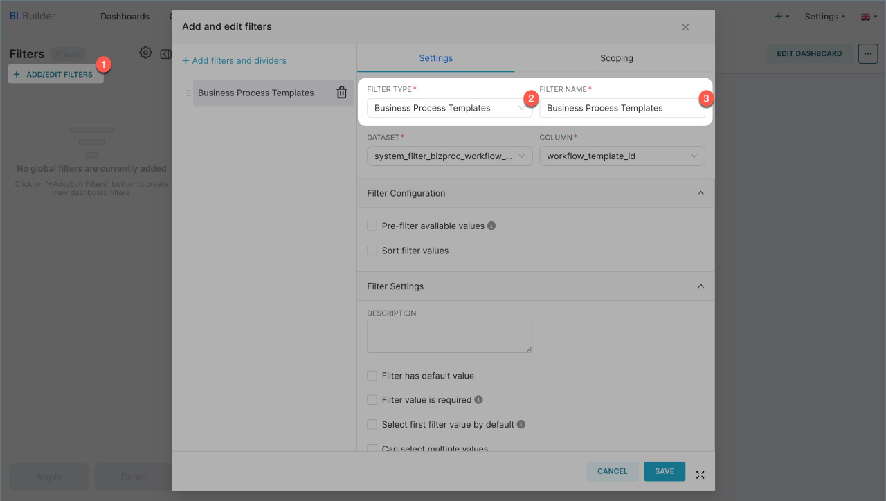 Para adicionar filtros, abra o relatório no modo de edição. No painel esquerdo, clique em Add/edit filters, selecione o tipo de filtro necessário, atribua um nome e salve a configuração.