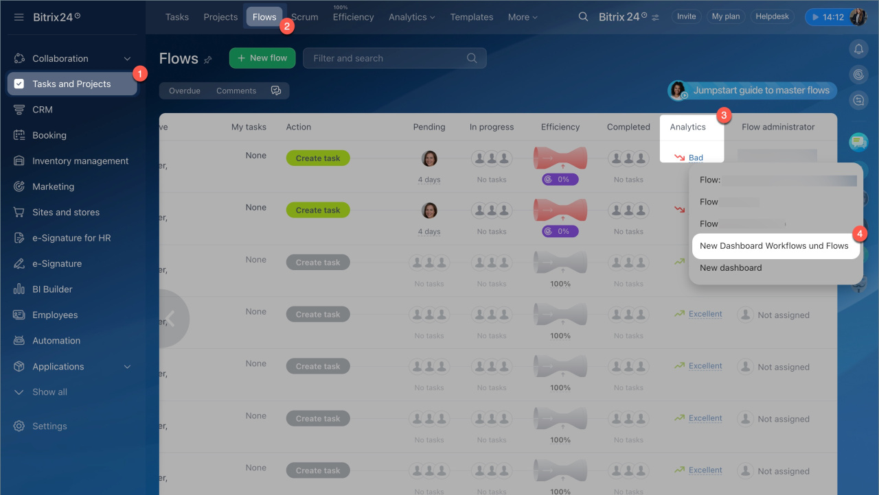 Fluxos de tarefas. Acesse Tarefas e projetos > Fluxos. Na coluna Analítica, clique no indicador do fluxo e abra o relatório.