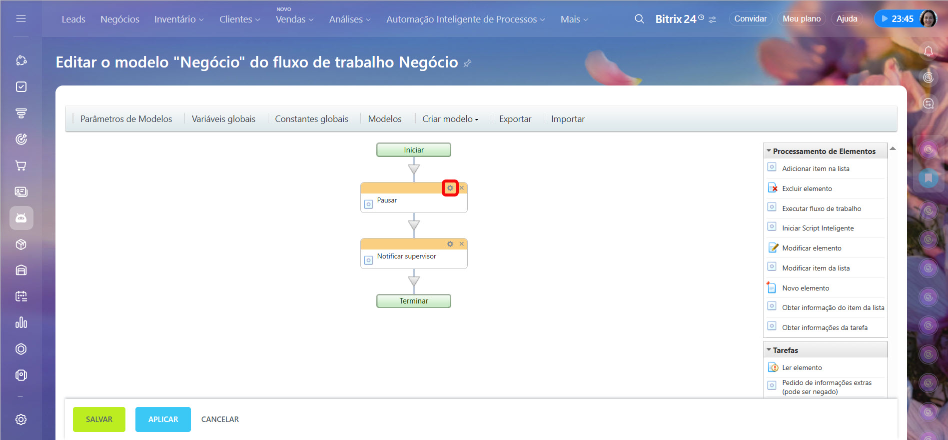 Selecione uma ação no fluxo de trabalho e clique no ícone de configurações.