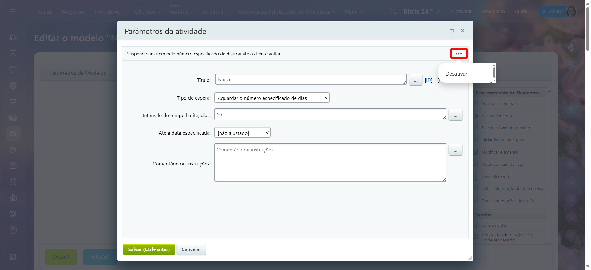 No menu da ação (canto superior direito), selecione a opção Desativar. Não se esqueça de salvar as alterações.
