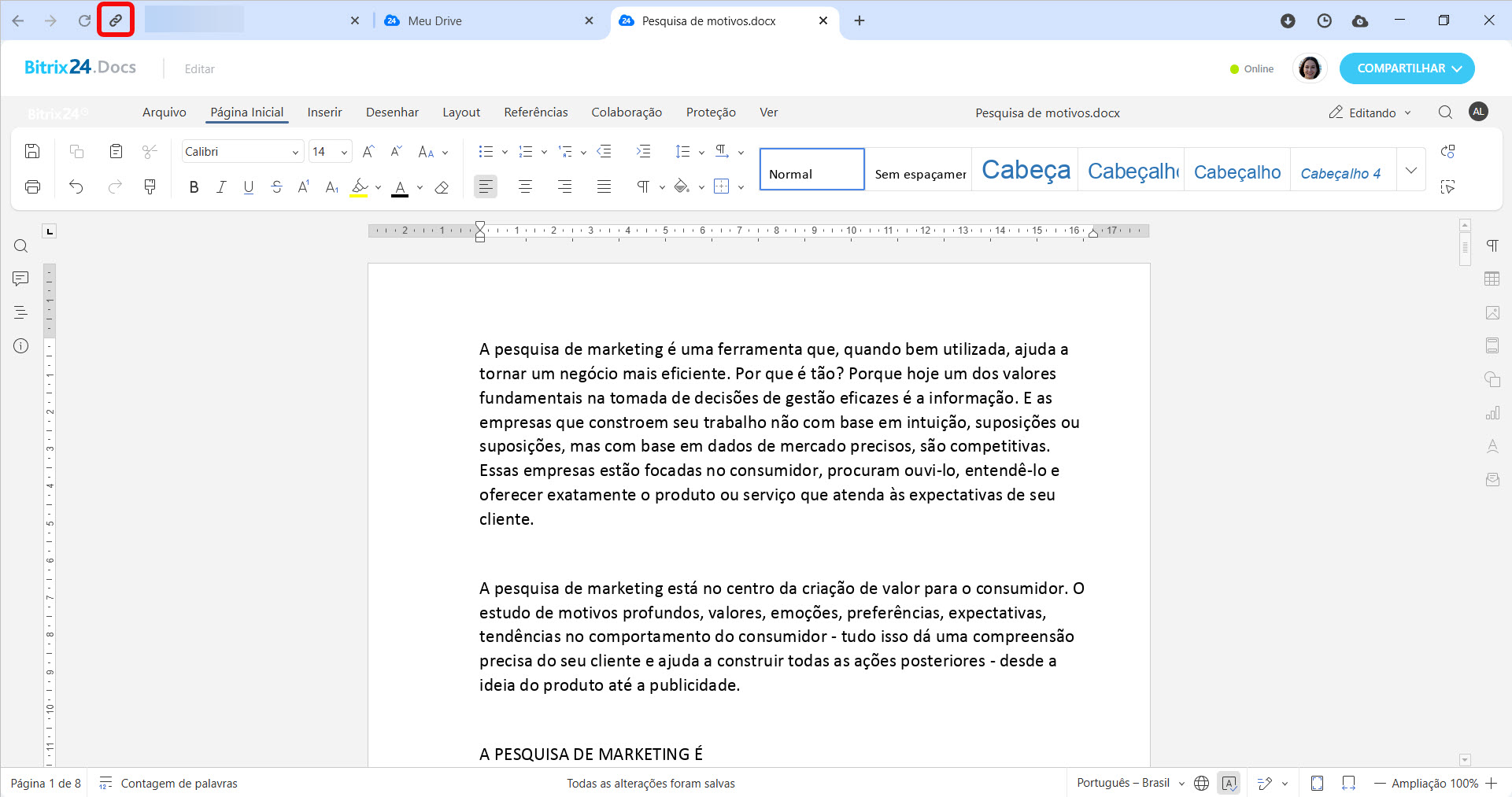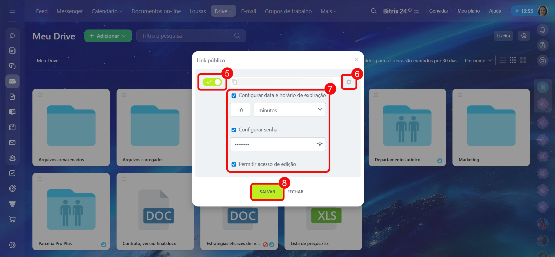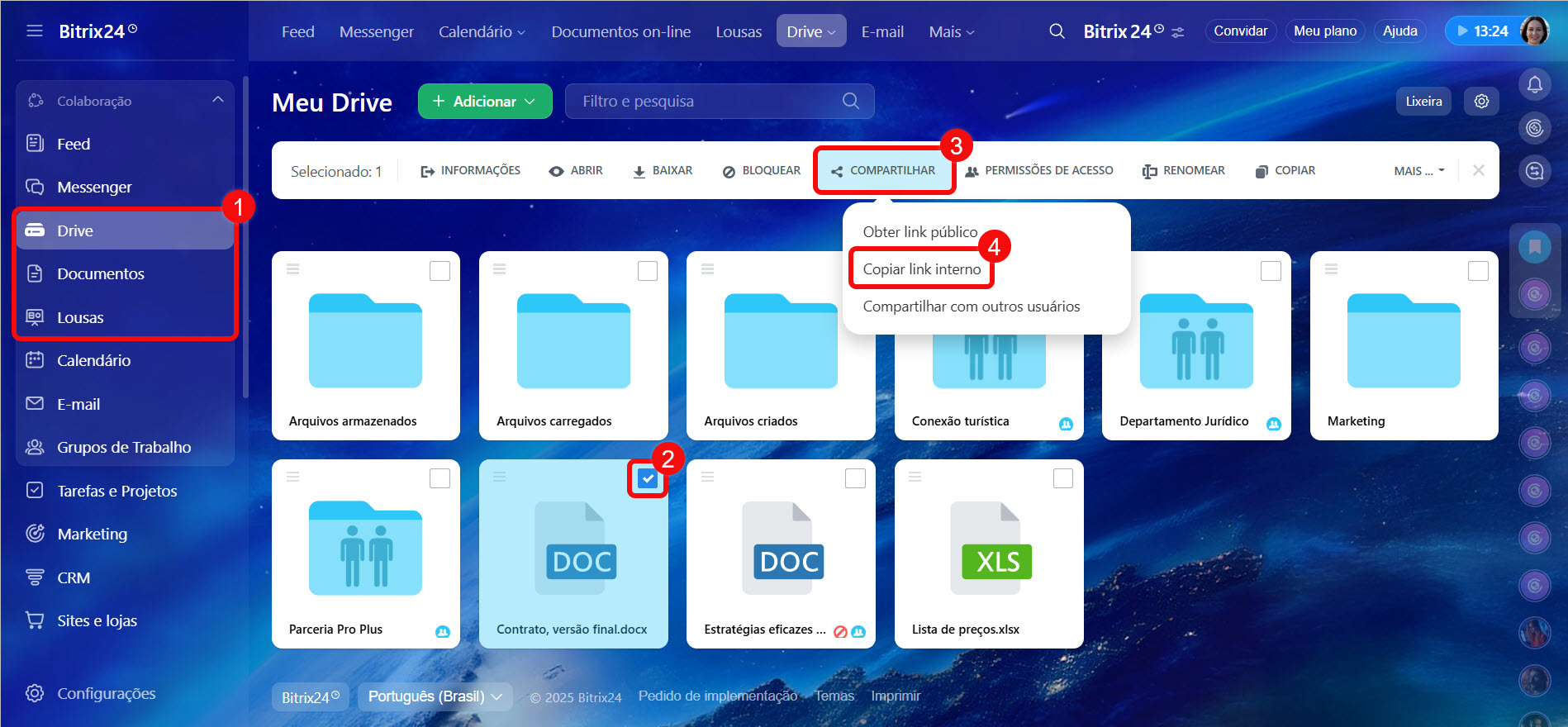 No Bitrix24, é possível compartilhar documentos por meio de links internos e públicos. Utilize links internos para colegas e links públicos para pessoas de fora da empresa.
