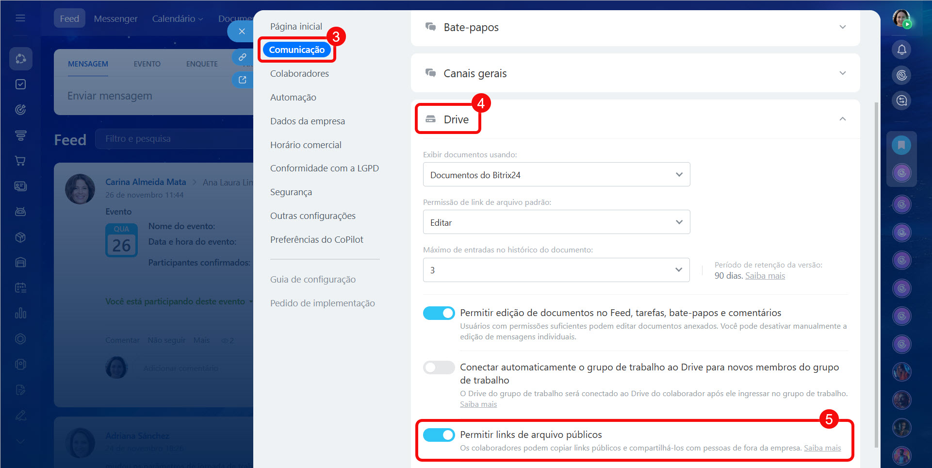 Acesse Configurações > Comunicação > Drive > Permitir links de arquivo públicos. Salve as alterações.