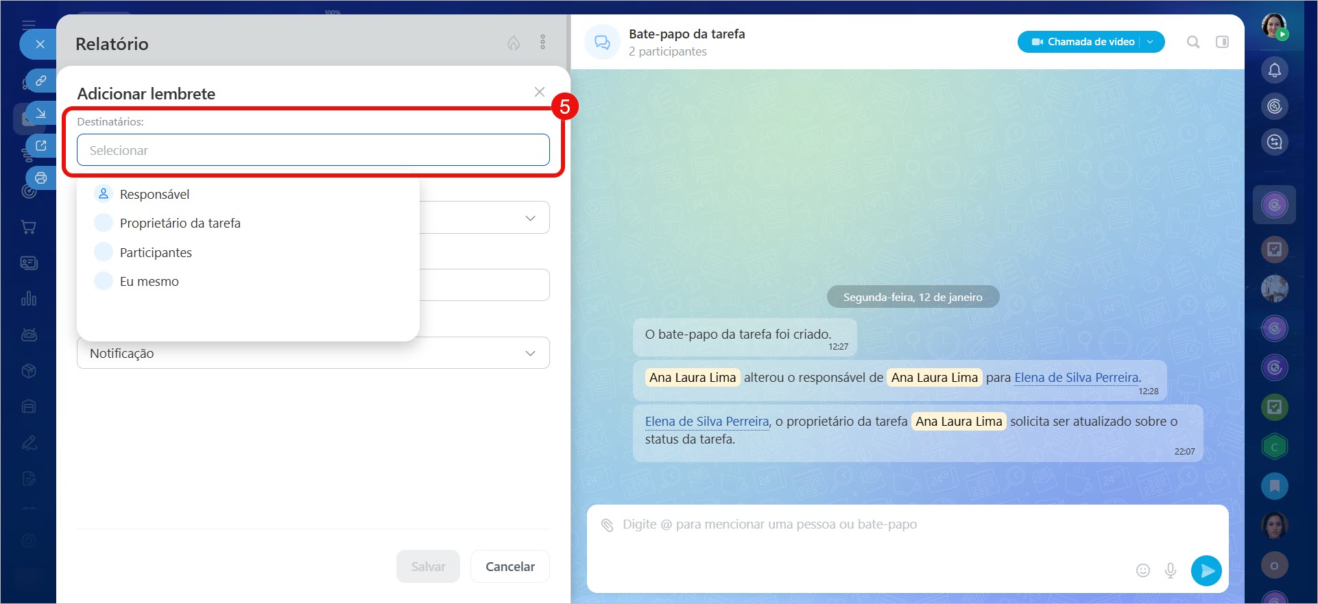 5. Escolha para quem criar o lembrete: para o responsável, o criador da tarefa, os participantes ou você mesmo.