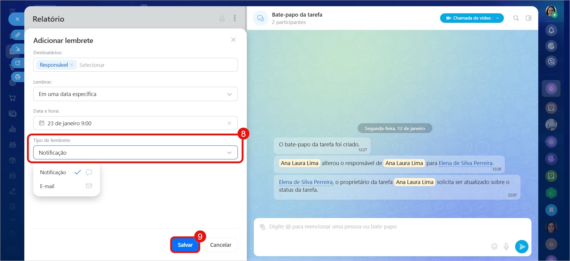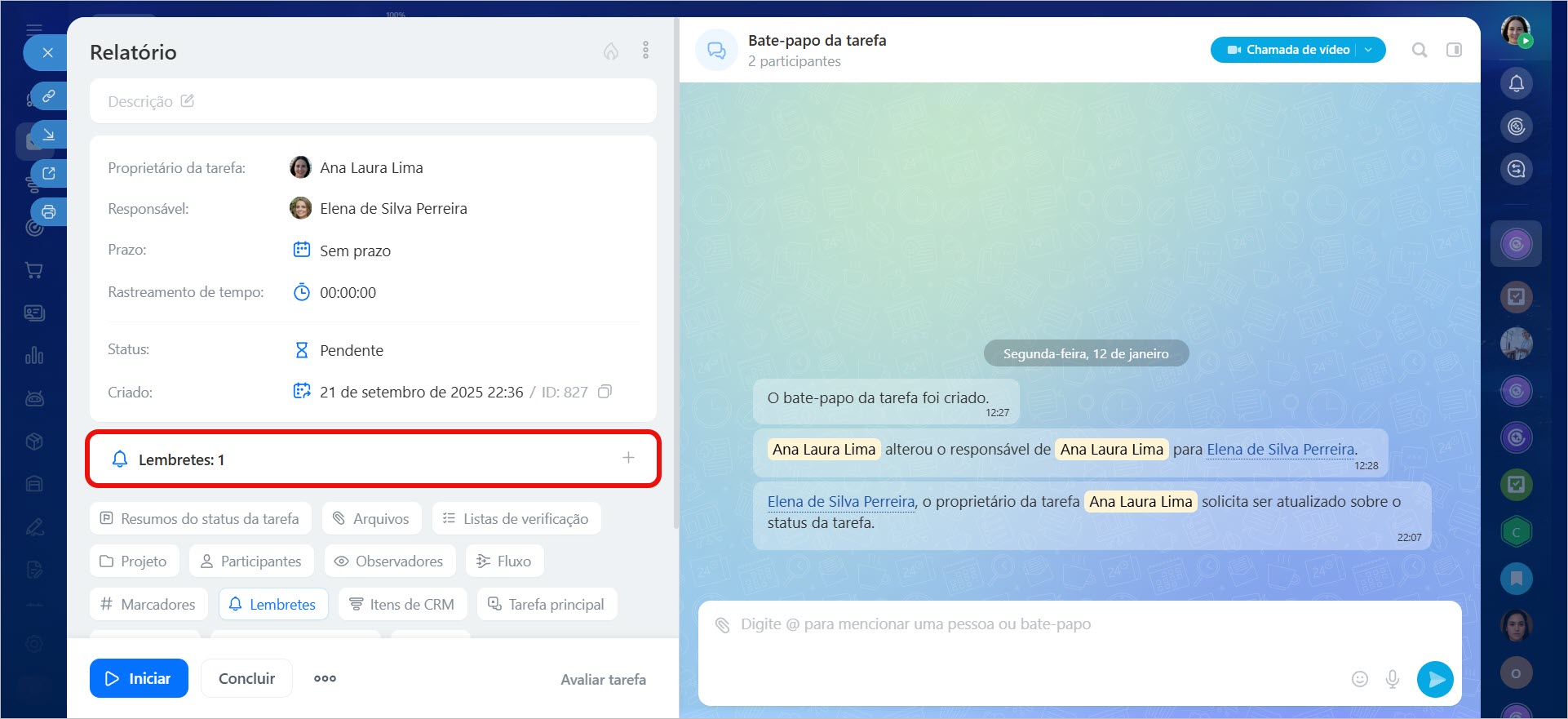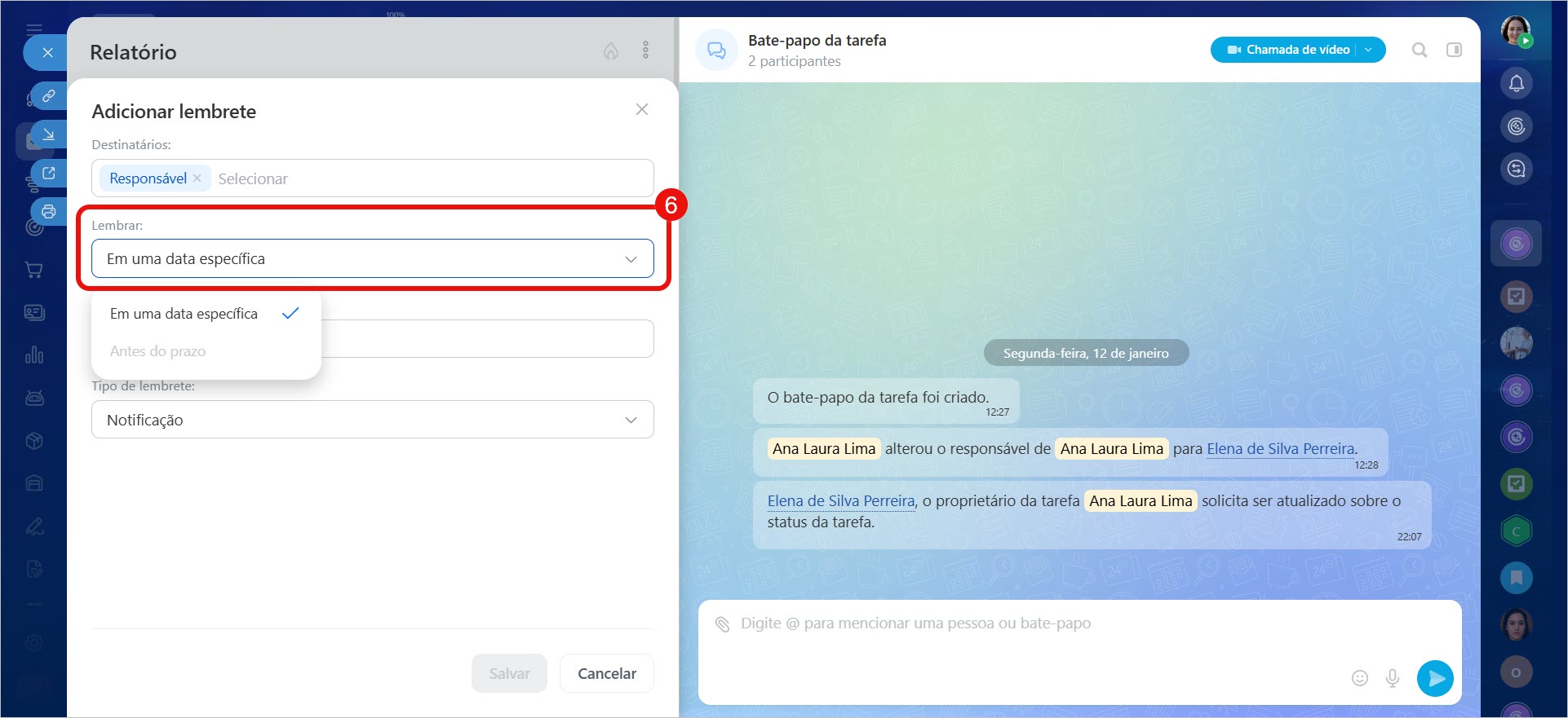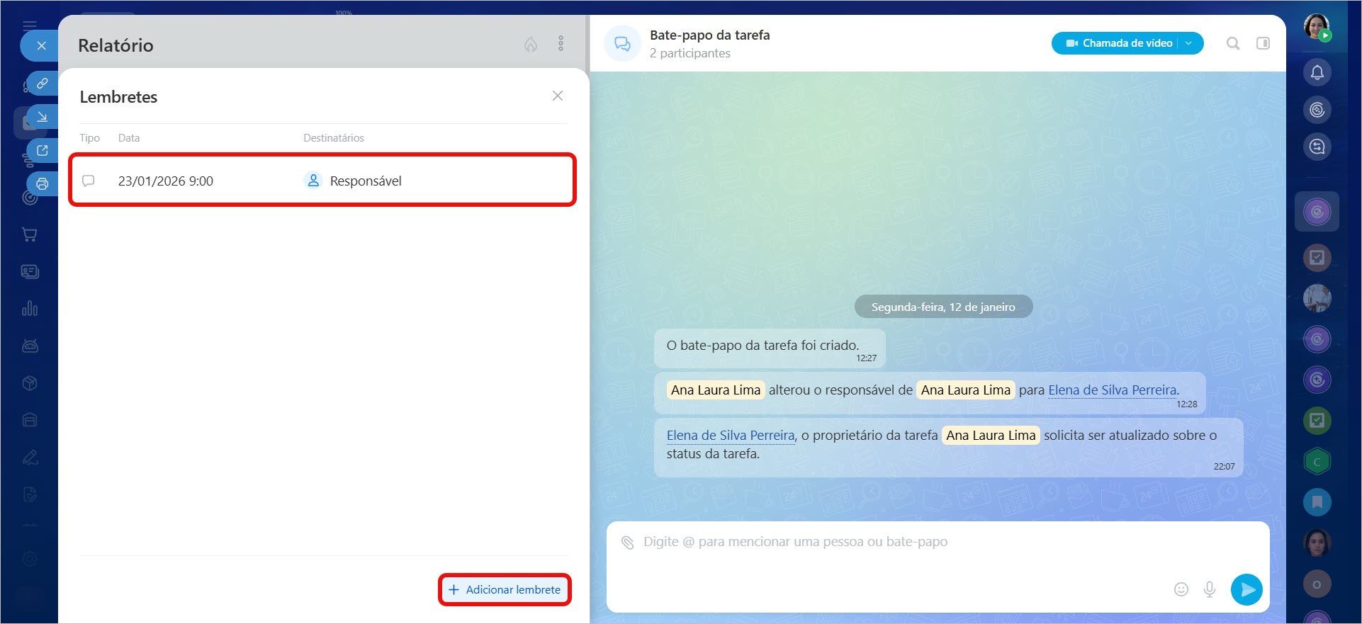 Qualquer participante pode adicionar um lembrete para si ou para colegas: para o responsável, o criador da tarefa ou um participante. Isso pode ser feito ao criar e editar uma tarefa.