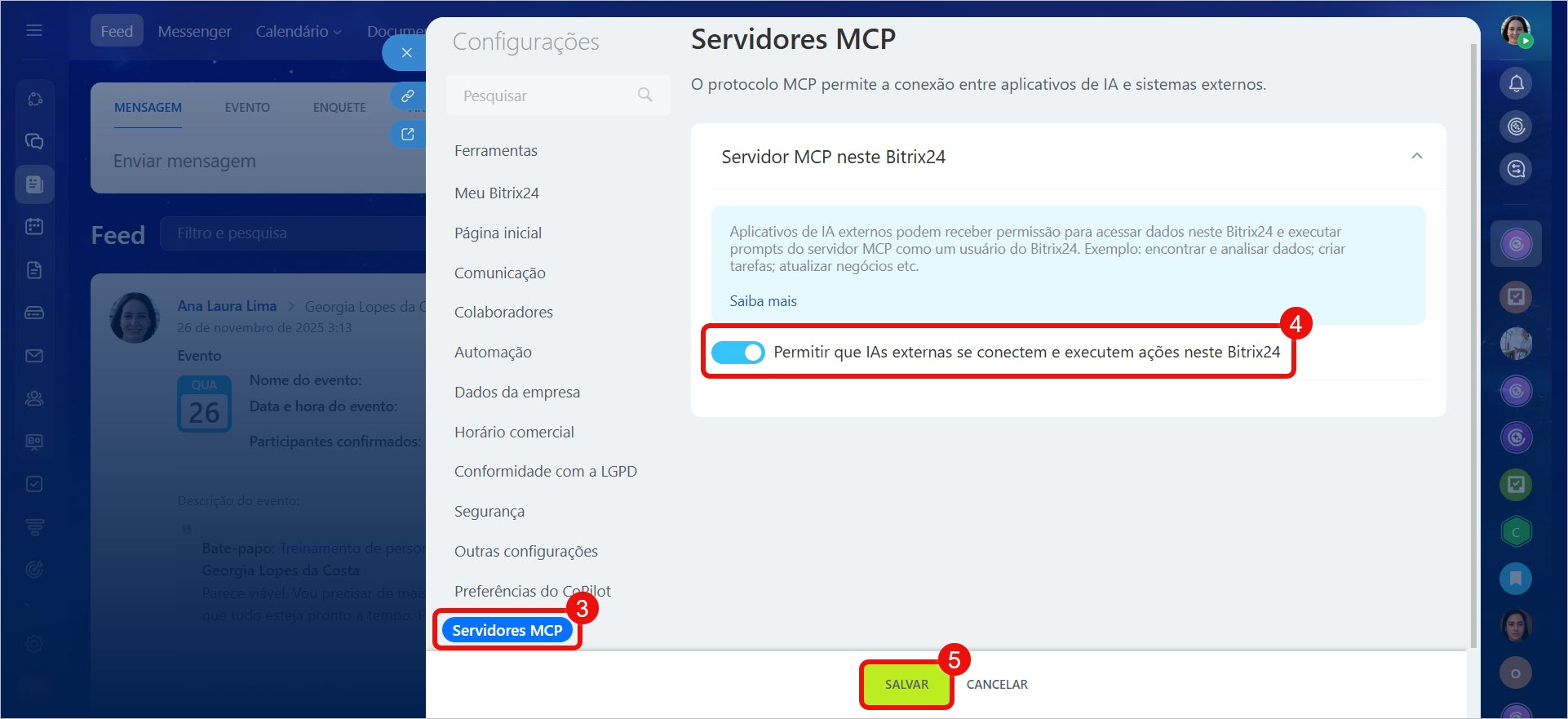 3-4. Na aba Servidores MCP, busque a seção Servidor MCP neste Bitrix24 e ative a opção Permitir que IAs externas se conectem e executem ações neste Bitrix24.