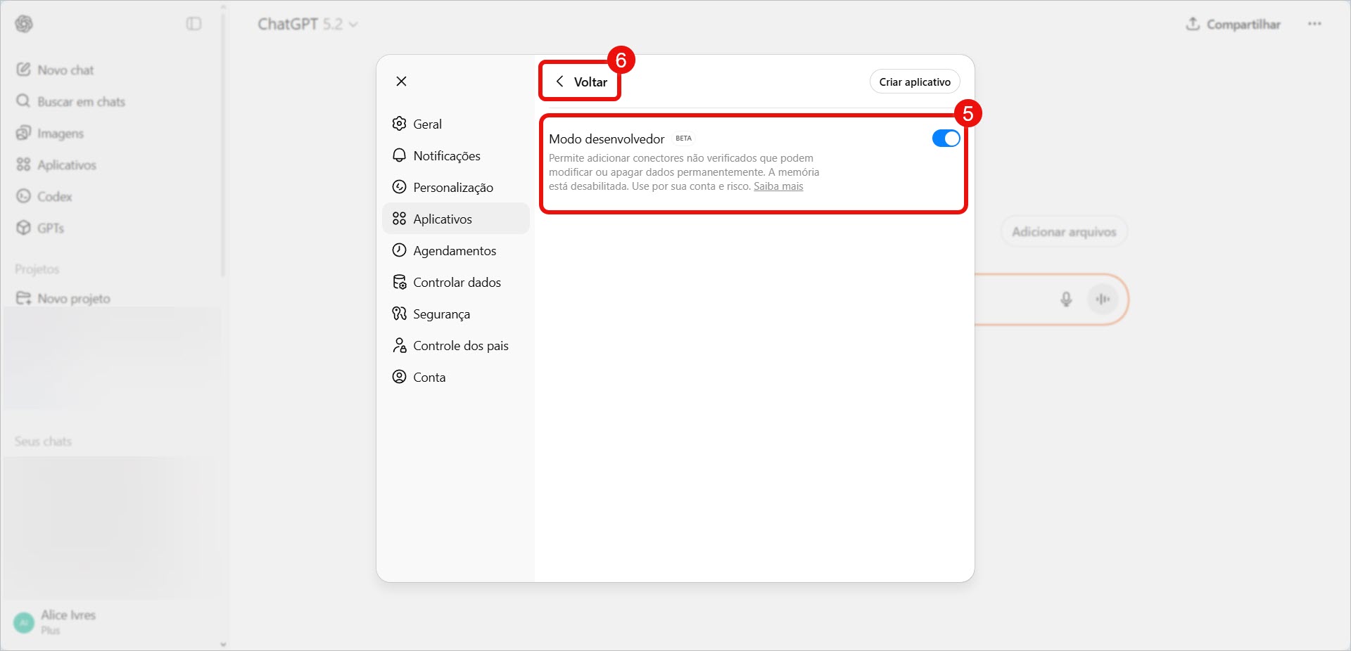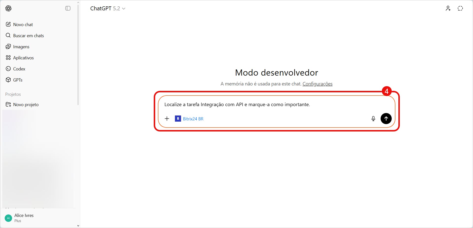 4. Formule sua solicitação indicando o que você deseja que seja feito. O ChatGPT processa a solicitação, pede confirmação e executa o comando.