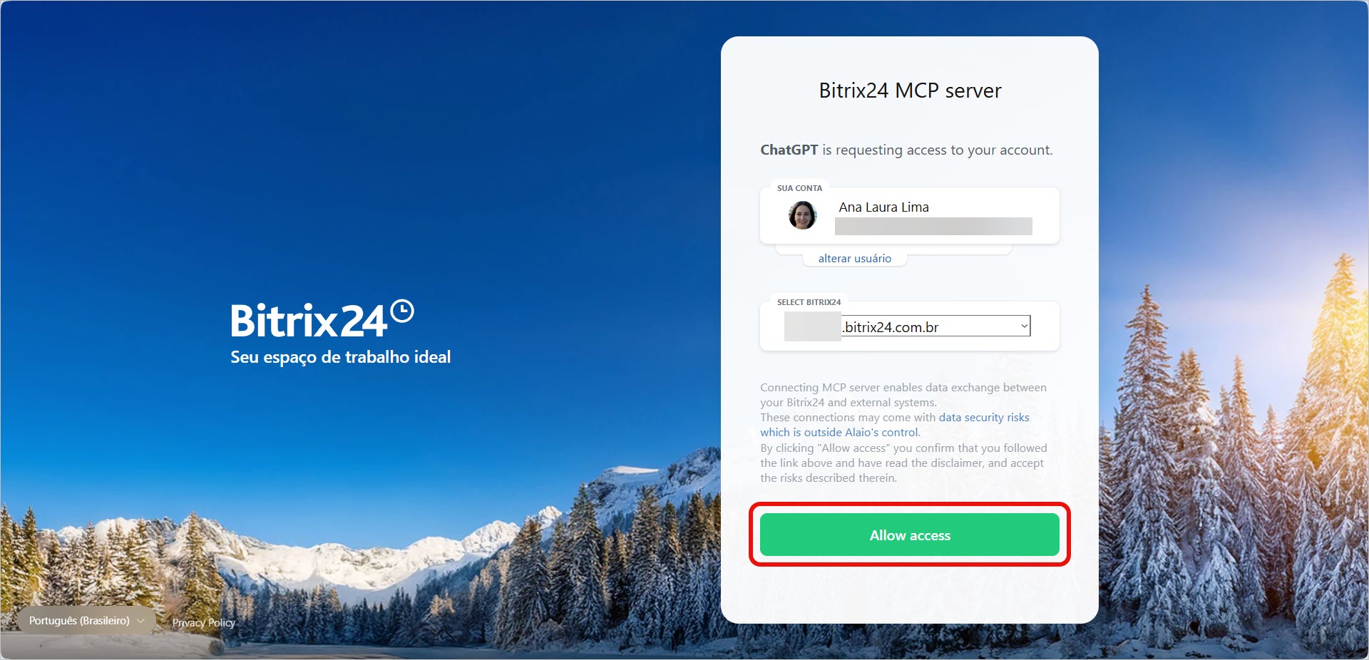 Faça login no Bitrix24. Entre na sua conta. O Bitrix24 será conectado ao ChatGPT e você poderá controlar as ferramentas diretamente do chat com o assistente de IA.
