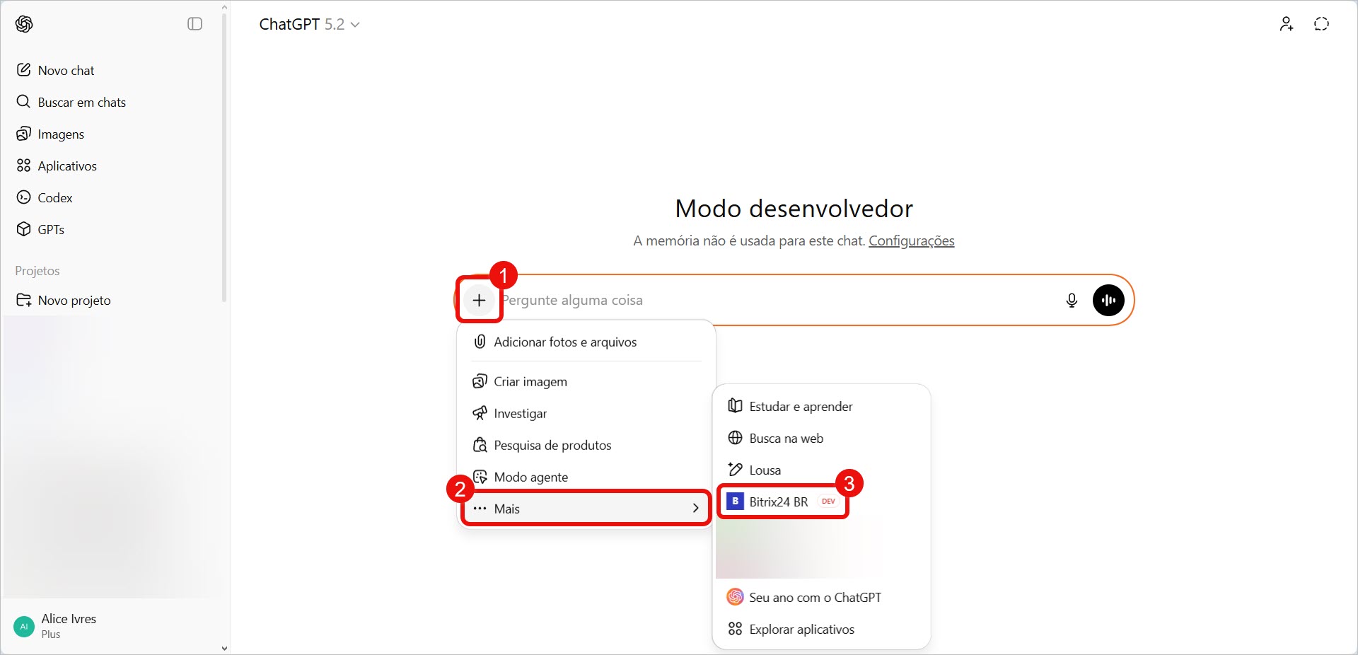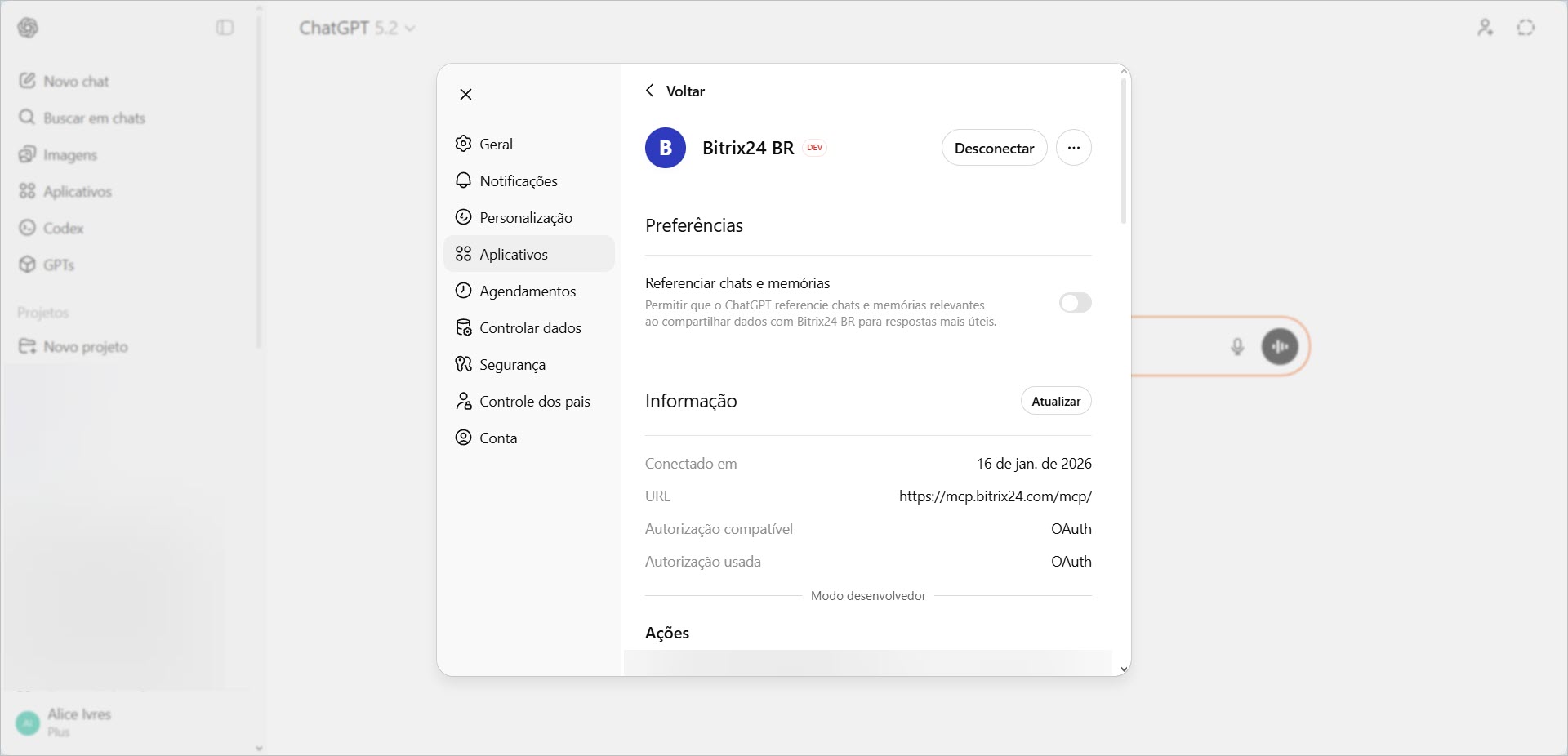 Tomando como exemplo a integração do Bitrix24 com o ChatGPT, mostramos como funciona a conexão. Esta configuração está disponível nos planos ChatGPT Plus e Pro.