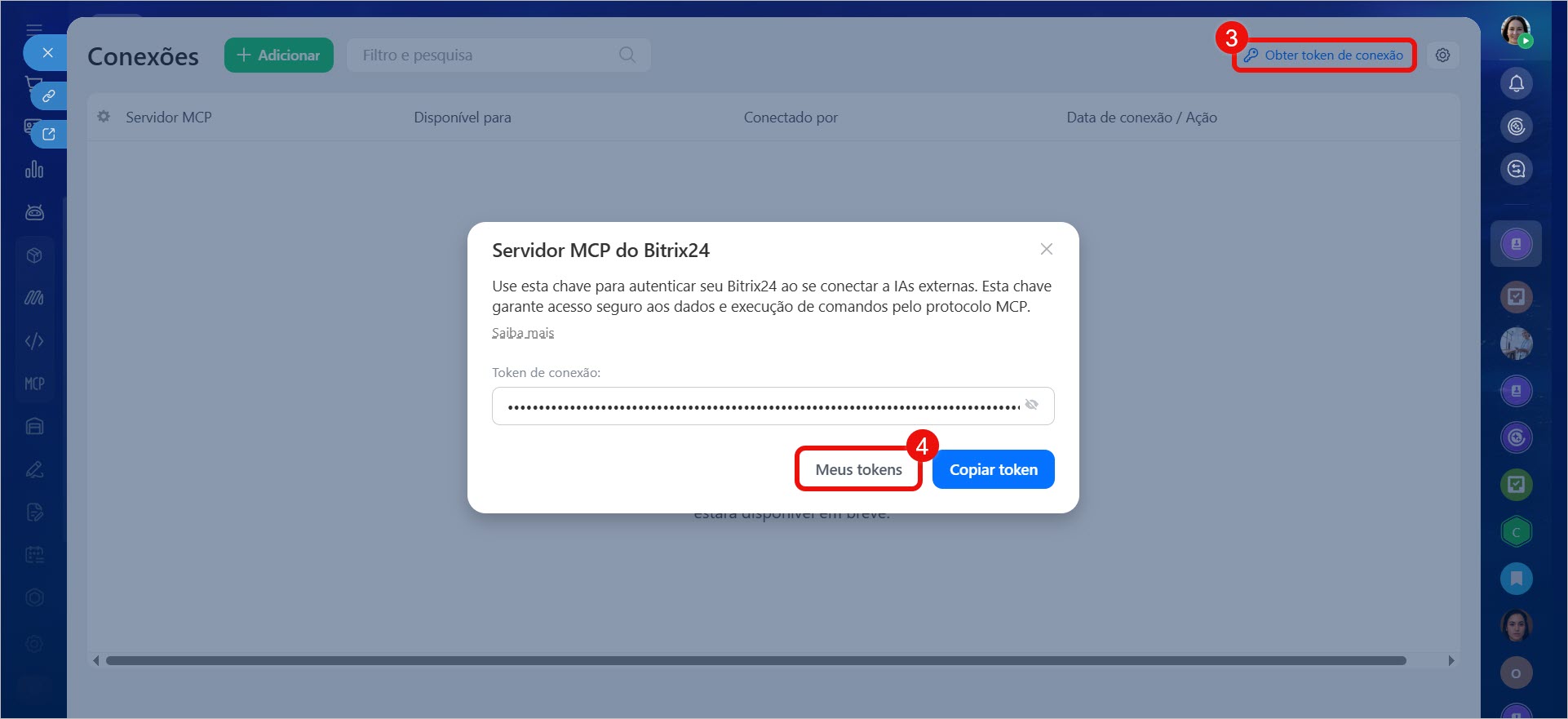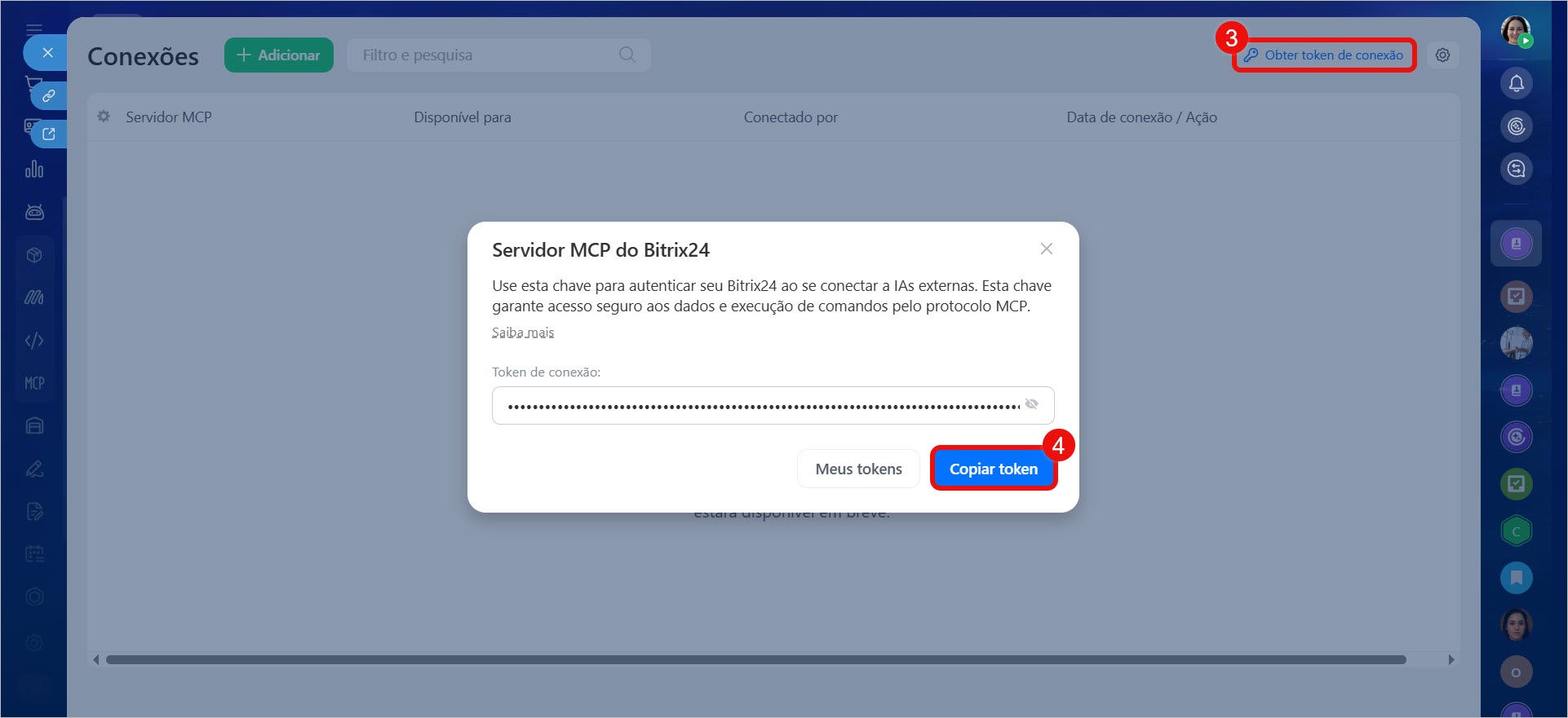Copie o token de conexão: permite integrar o Bitrix24 a um sistema de IA externo.