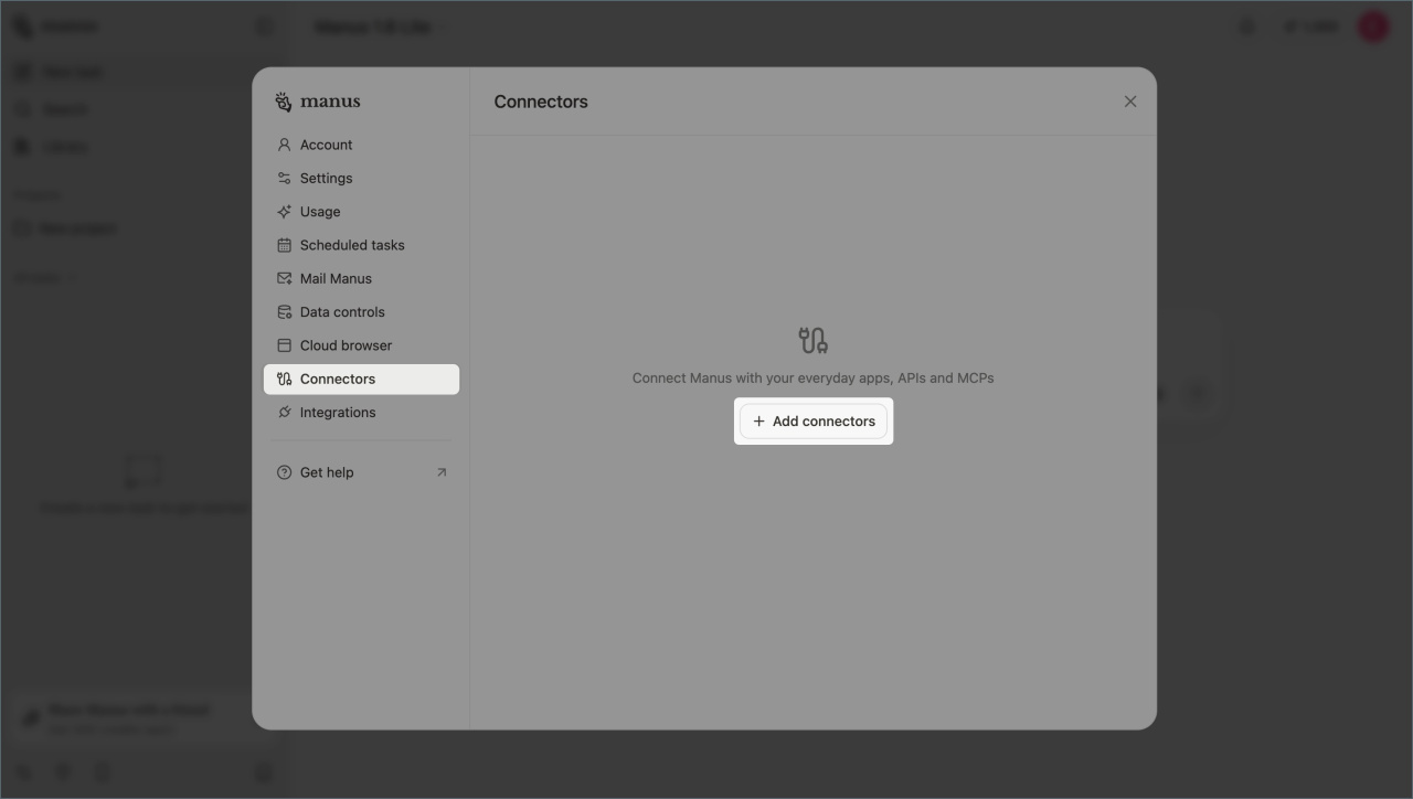 Com sistemas de IA externos como ChatGPT, Claude, Cursor ou Manus, você pode gerenciar as tarefas diretamente do chat. A lista de integrações, seções e ações disponíveis está em constante expansão.