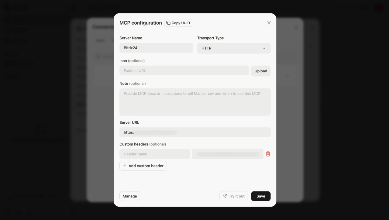 Explicaremos a conexão usando como exemplo a integração do Bitrix24 com o Manus AI.