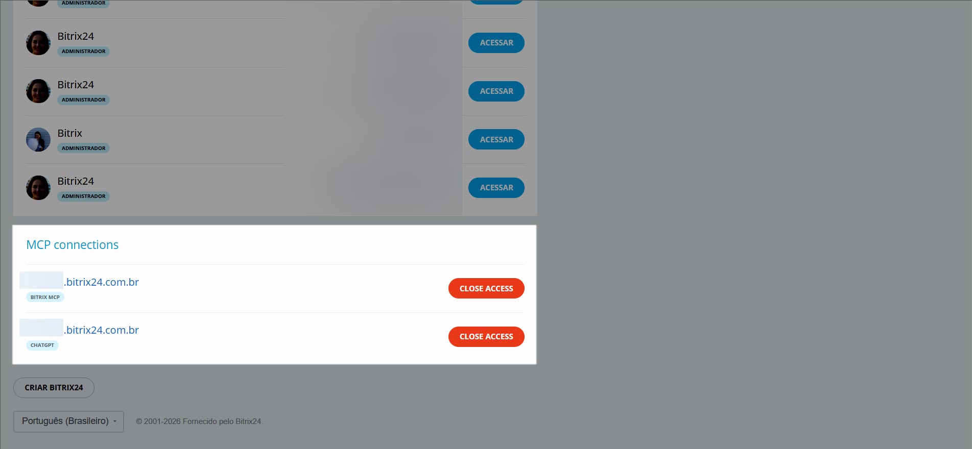 Por padrão, não é possível trabalhar no Bitrix24 a partir de sistemas de IA externos, mas o administrador da conta pode habilitar esta opção.