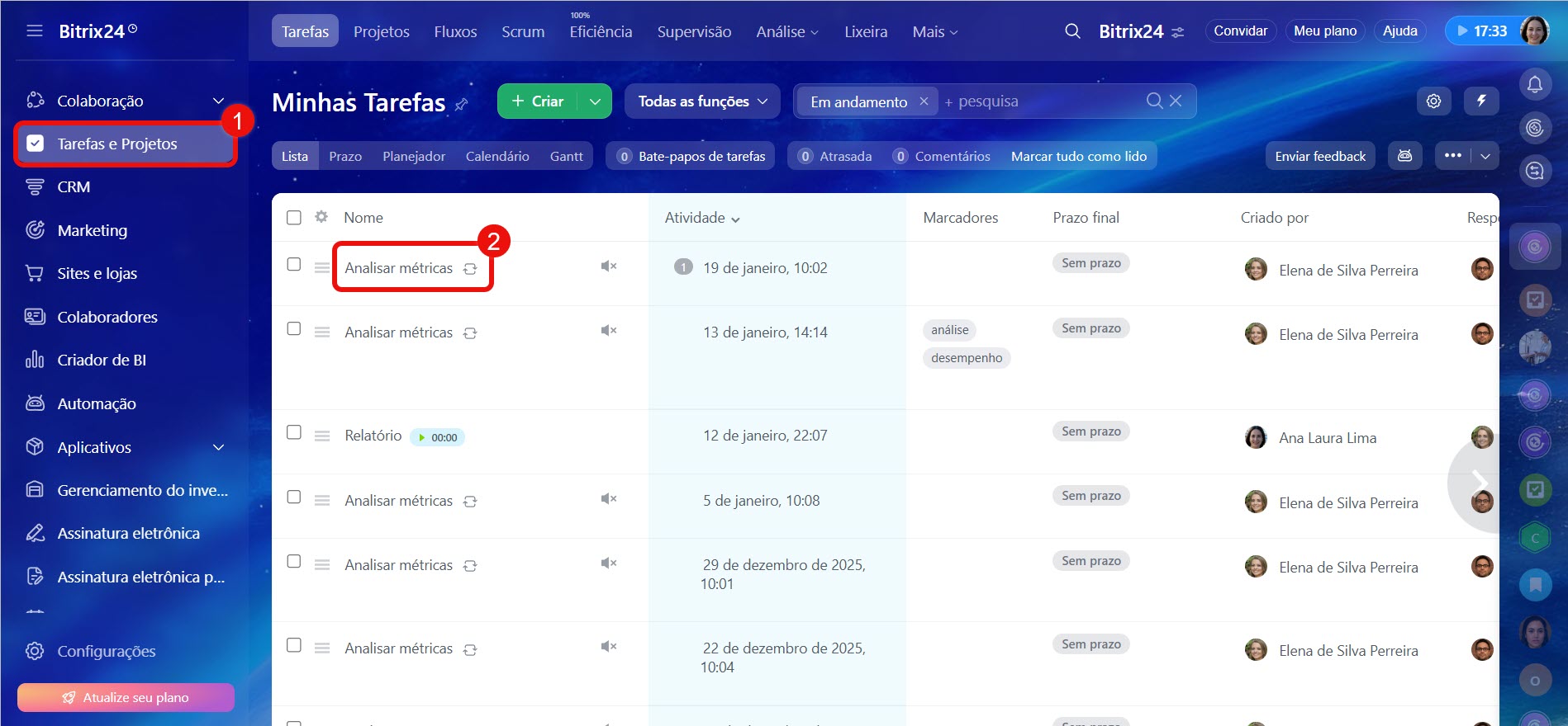 1–2. Acesse Tarefas e Projetos, crie uma nova tarefa ou abra uma existente.
