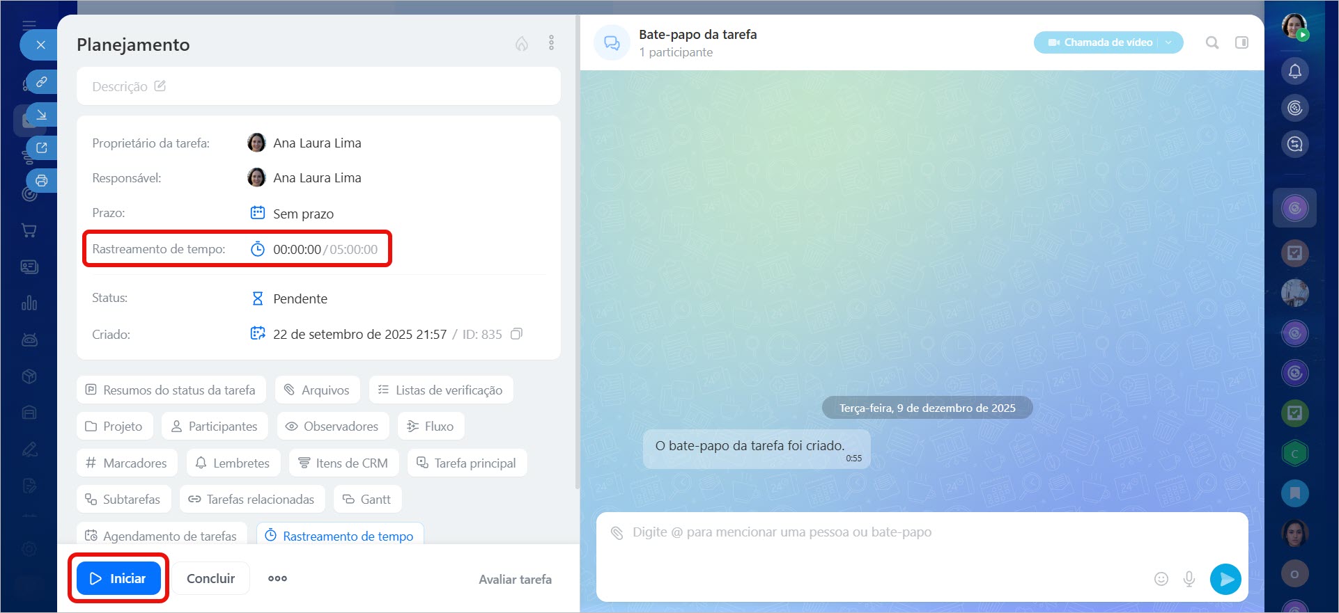 O responsável e os participantes podem ativar o rastreamento de tempo diretamente no cartão da tarefa ou na lista.