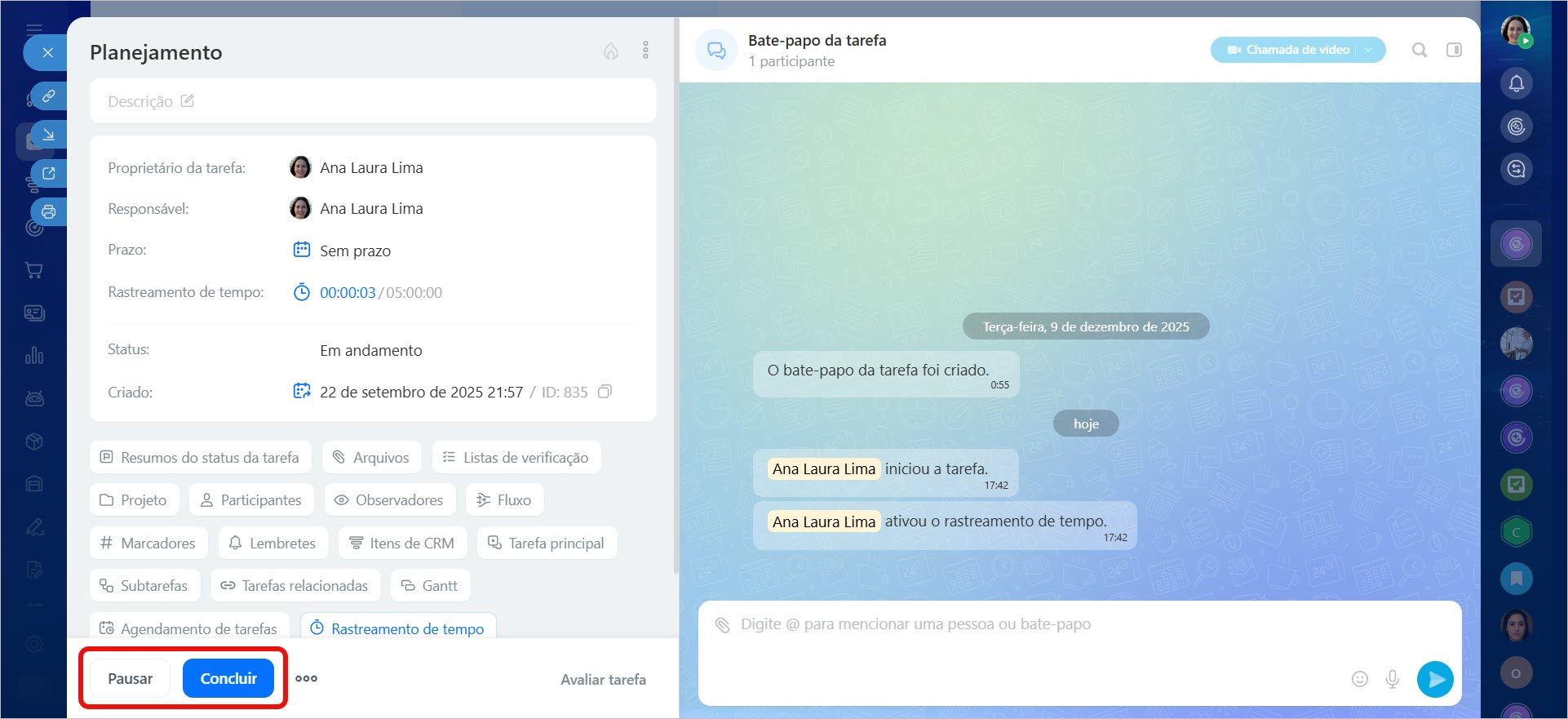 - Concluir – a tarefa será fechada e a contagem de tempo será interrompida.