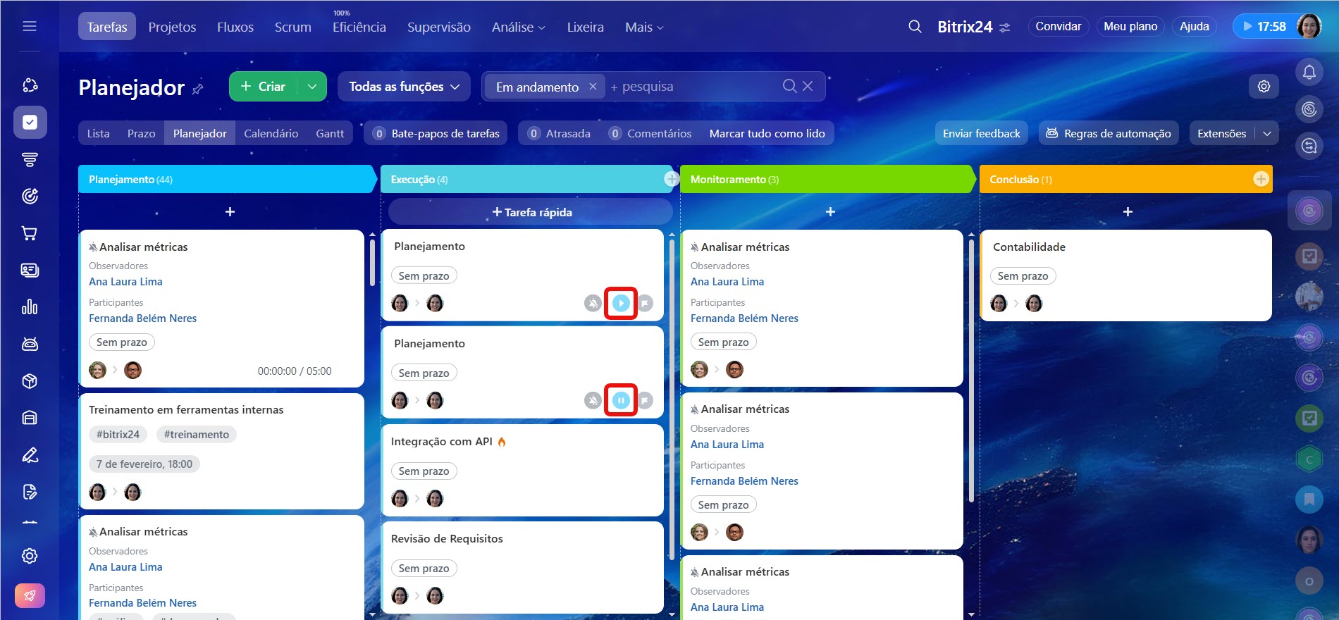 - É possível iniciar e pausar o cronômetro diretamente no cartão da tarefa ou na lista de tarefas.