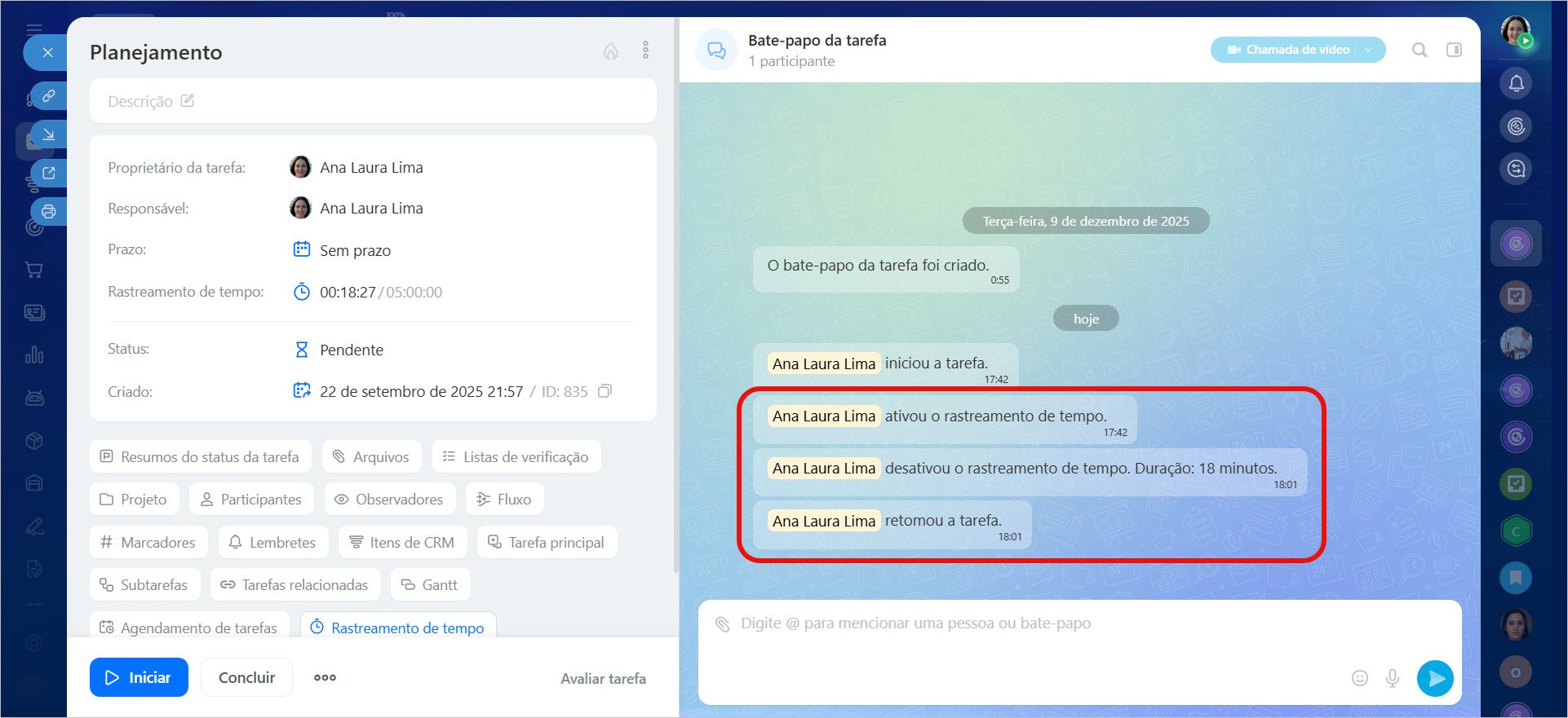 O histórico de rastreamento de tempo mostra quem, quando e por quanto tempo trabalhou na tarefa. Os registros podem ser vistos no chat da tarefa ou em seu cartão.