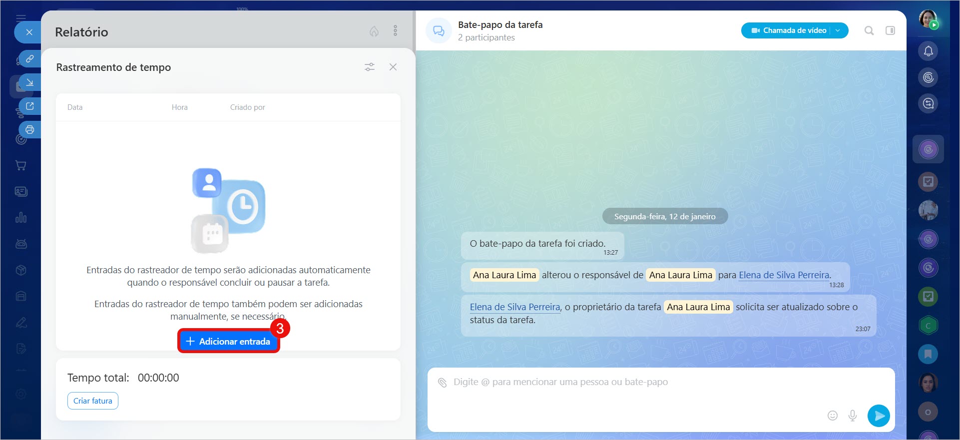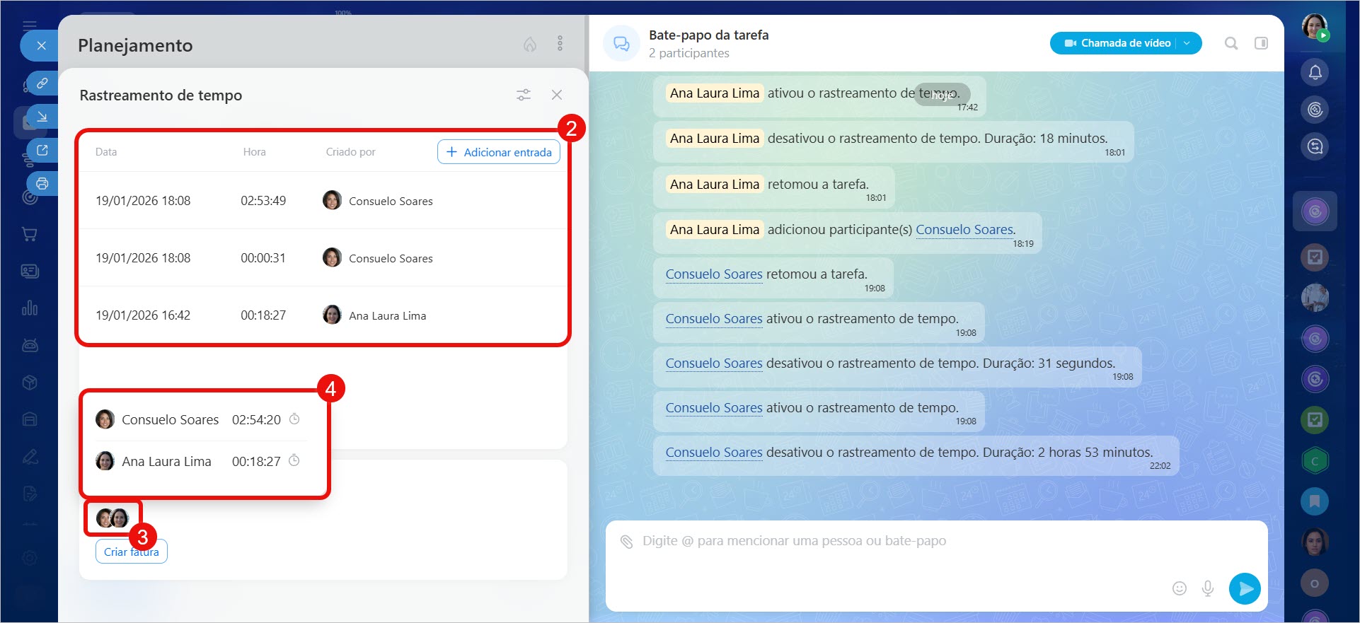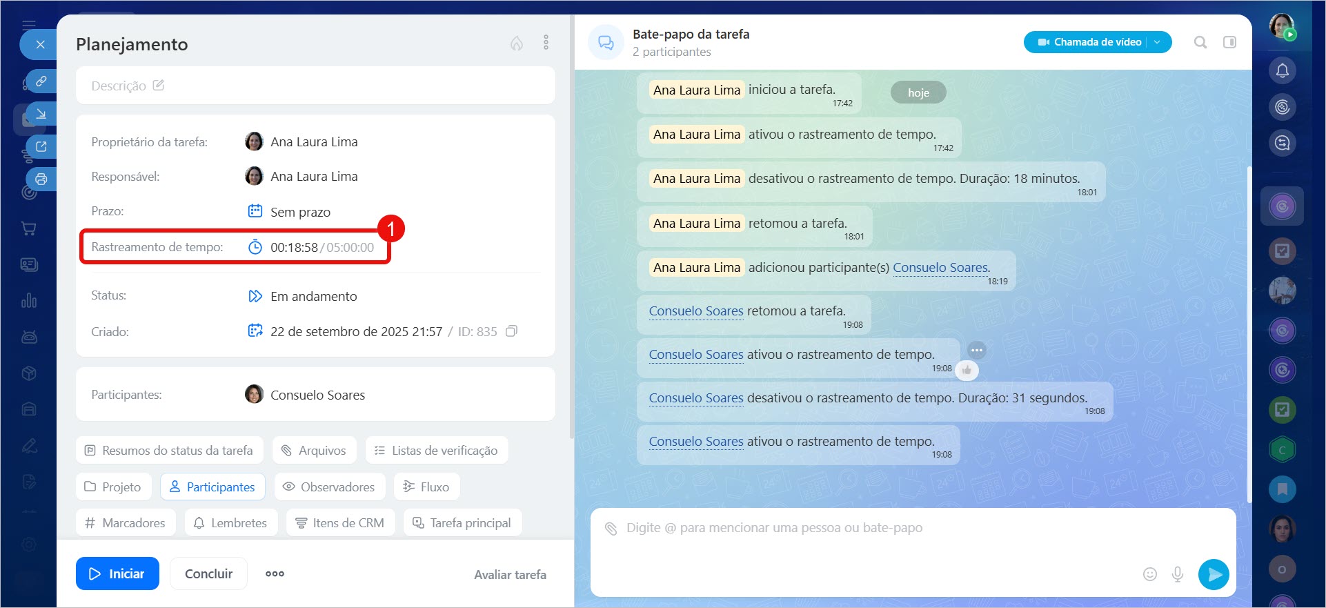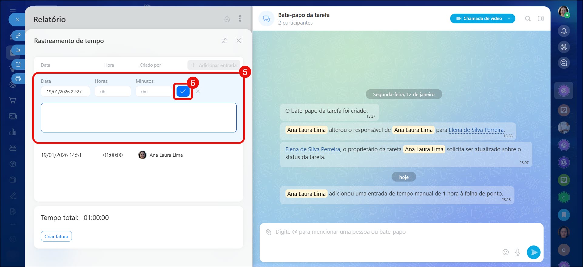 Todos os dados são salvos automaticamente no cartão da tarefa. Assim, os participantes não precisam fazer o controle manualmente, e o supervisor pode ver com mais facilidade há quanto tempo a equipe trabalha na tarefa e avaliar a contribuição de cada membro.