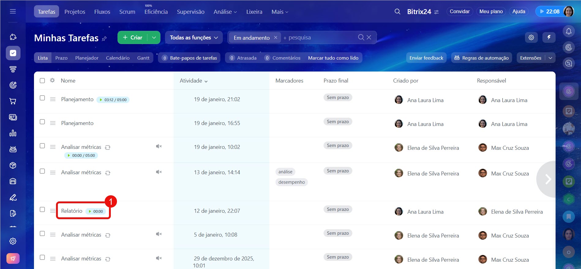 - No Bitrix24, é possível controlar quanto tempo os colaboradores gastam para concluir uma tarefa específica. Todos os dados são salvos automaticamente no cartão da tarefa.