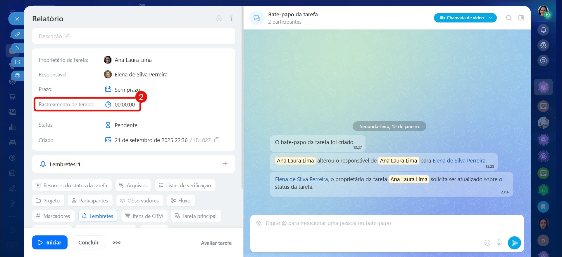 - Iniciar – começa a contagem de tempo. O tempo gasto pela equipe na tarefa é exibido no rastreador.
