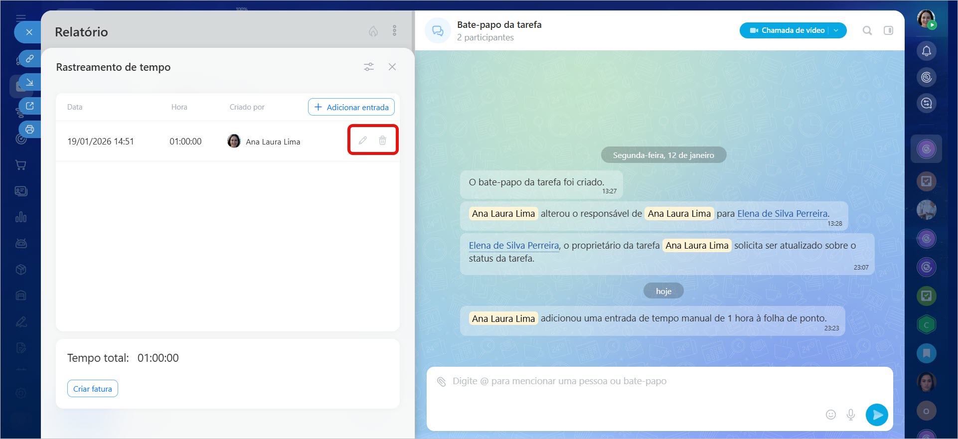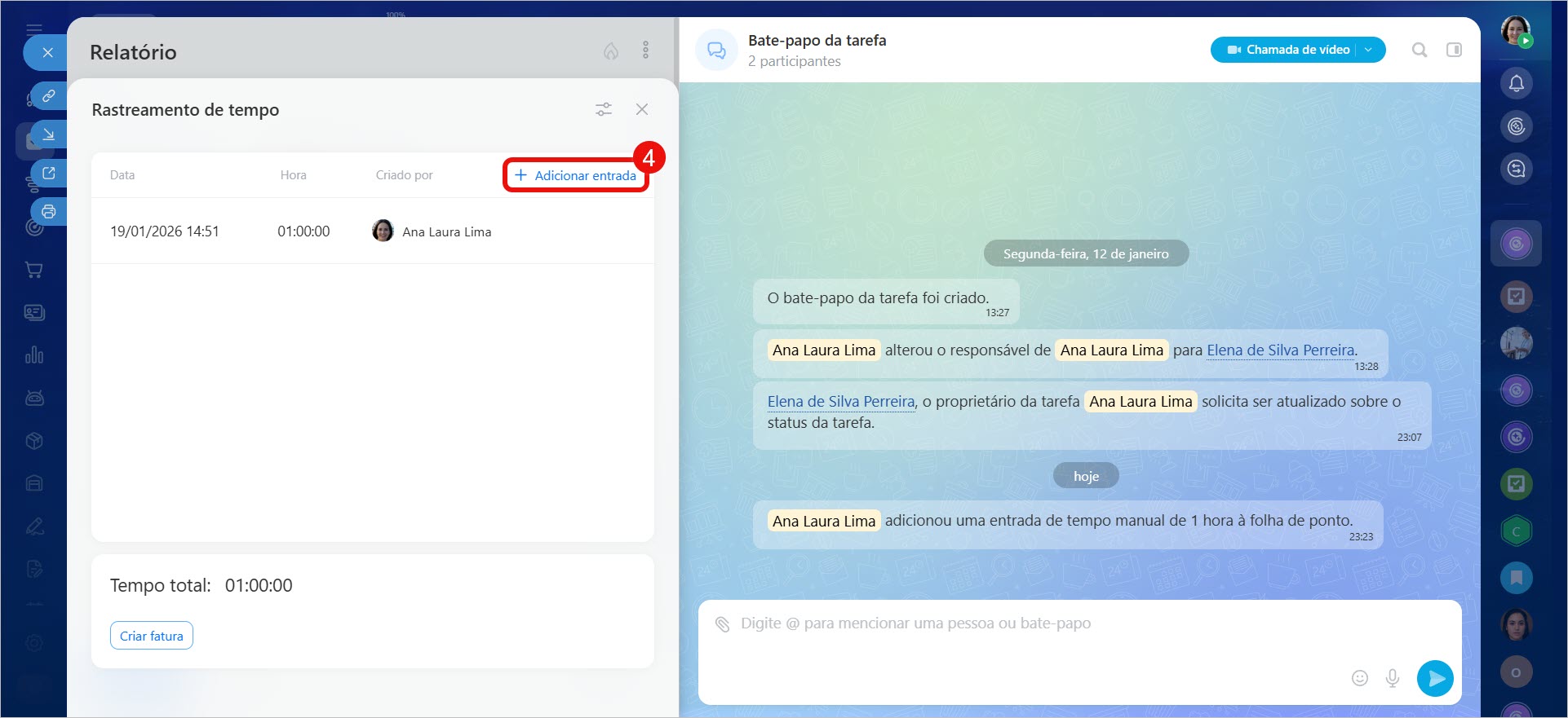 - O histórico de rastreamento de tempo mostra quem, quando e por quanto tempo trabalhou na tarefa. O histórico pode ser visualizado no chat da tarefa ou em seu cartão.