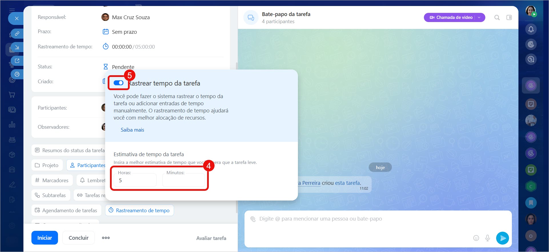 O supervisor pode ativar o rastreamento de tempo ao criar ou editar uma tarefa.