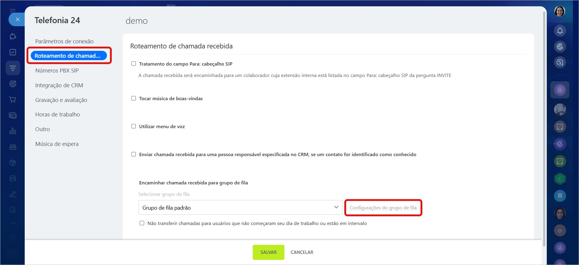 As chamadas de um formulário de retorno do CRM são direcionadas aos colaboradores configurados na guia Telefonia > Configurar números > Roteamento de chamada recebida > Configuração da fila, e não ao responsável atribuído ao formulário.