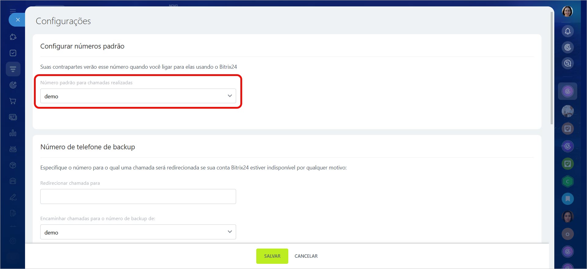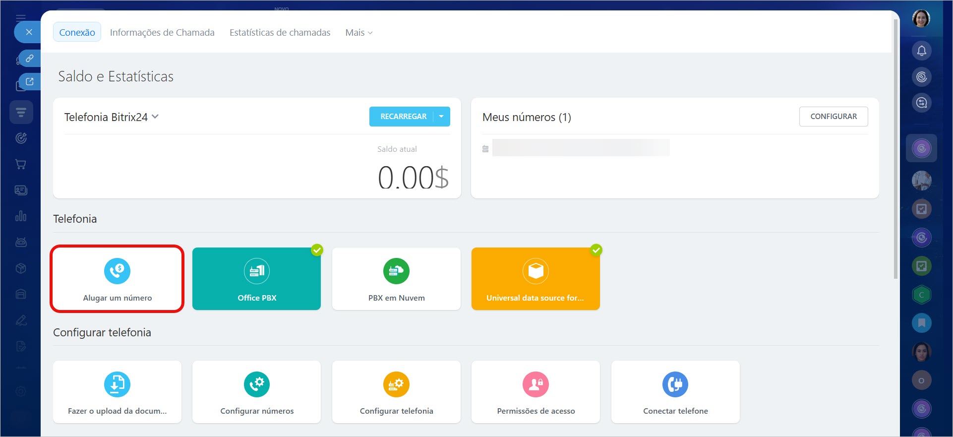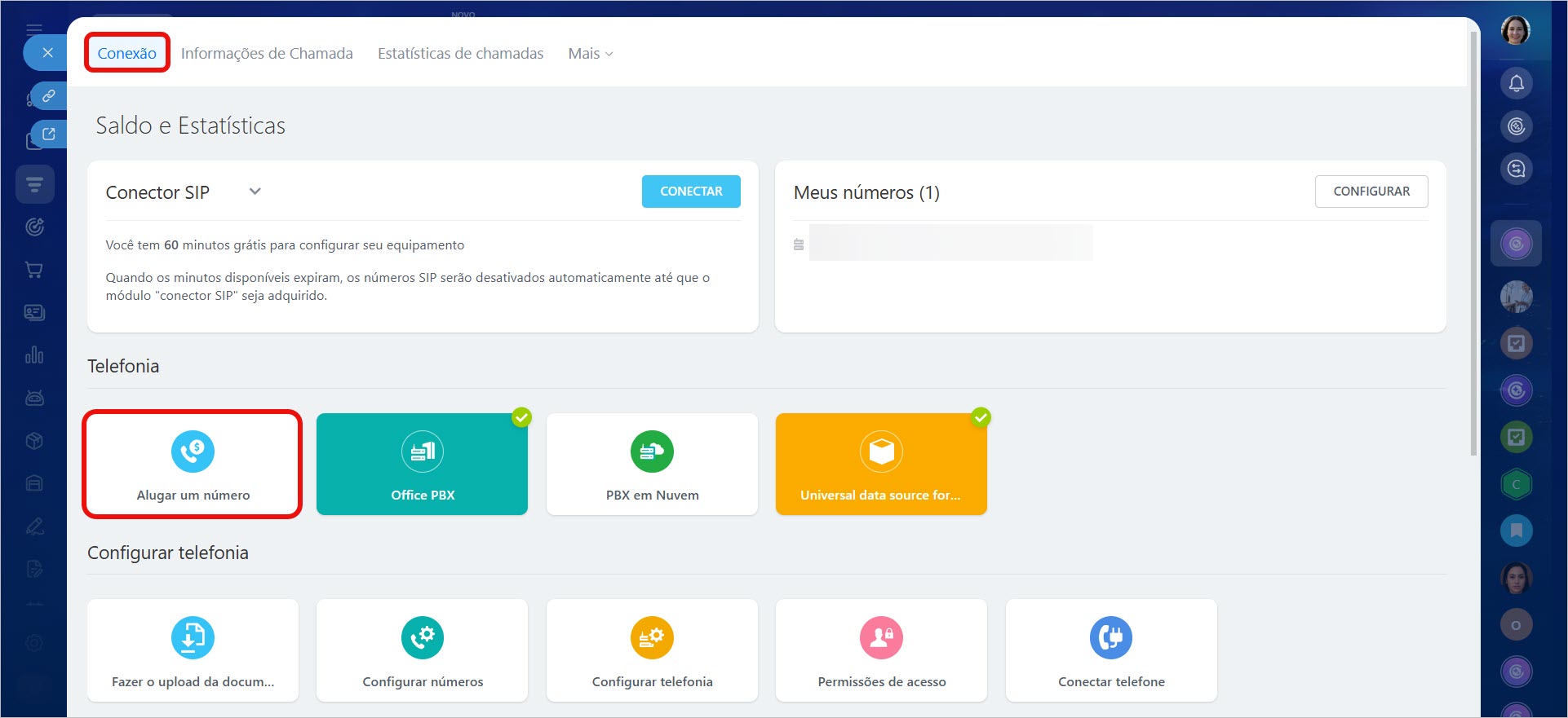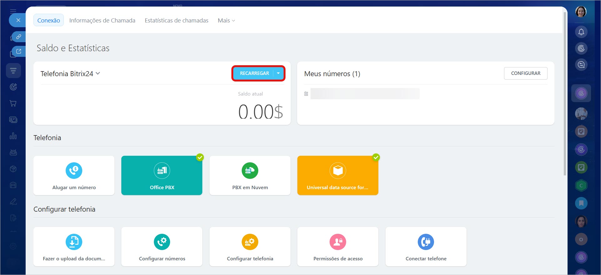 Ao conectar a telefonia por meio do conector SIP, os pagamentos pelas chamadas são feitos diretamente à operadora da PBX. Não é necessário recarregar o saldo no Bitrix24.