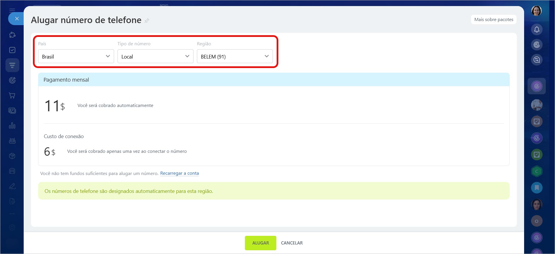 Alugar um número. Esta opção permite conectar um número virtual de nosso fornecedor de telefonia.