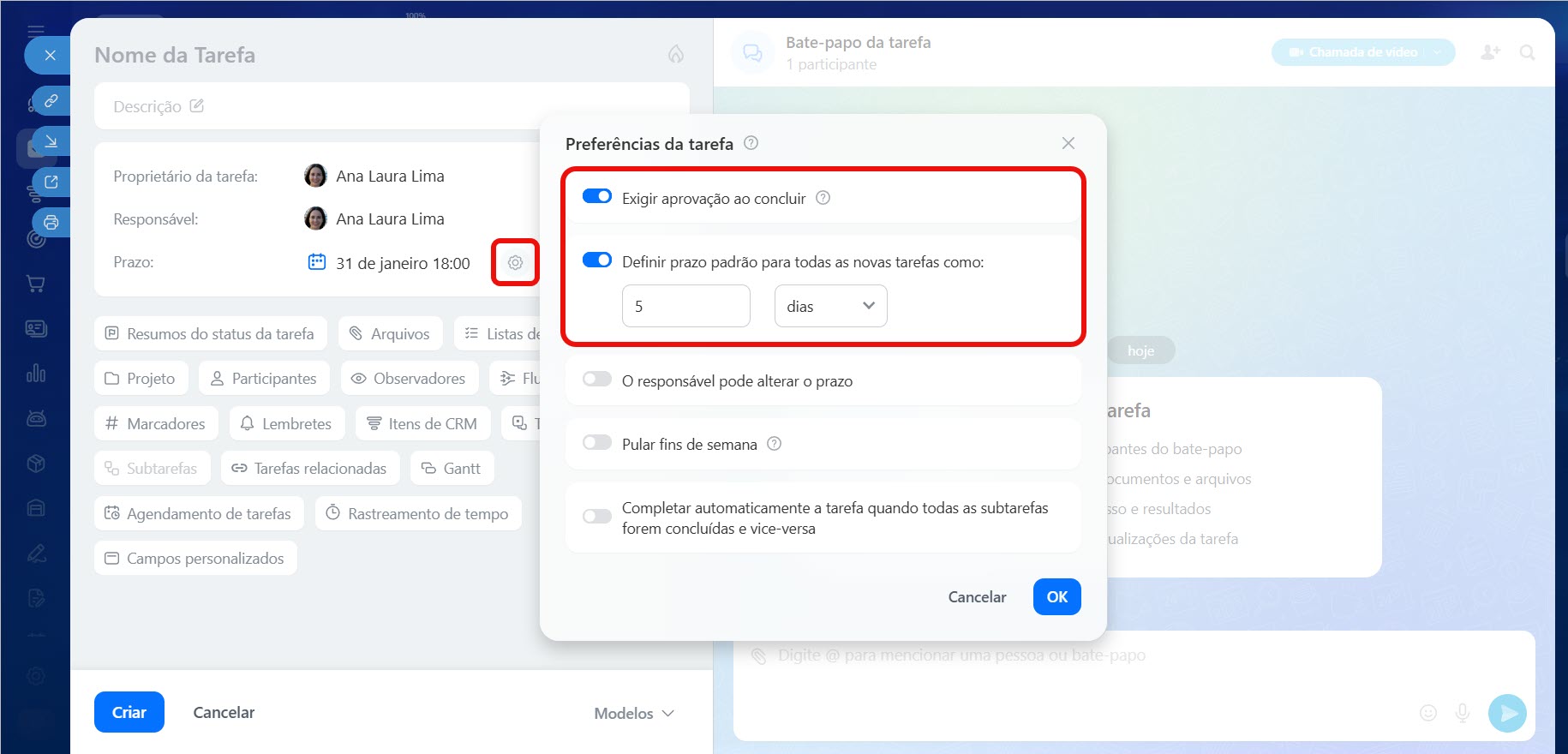 - Nas configurações do prazo final, você pode detalhar: permitir ou restringir o adiamento do prazo, inserir automaticamente o prazo em novas tarefas ou exigir uma verificação obrigatória do resultado antes da conclusão.