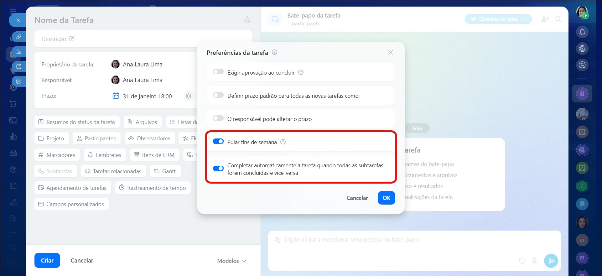 Ignorar finais de semana — ative a opção para que o prazo final seja automaticamente transferido para o próximo dia útil, se cair em um final de semana ou feriado.