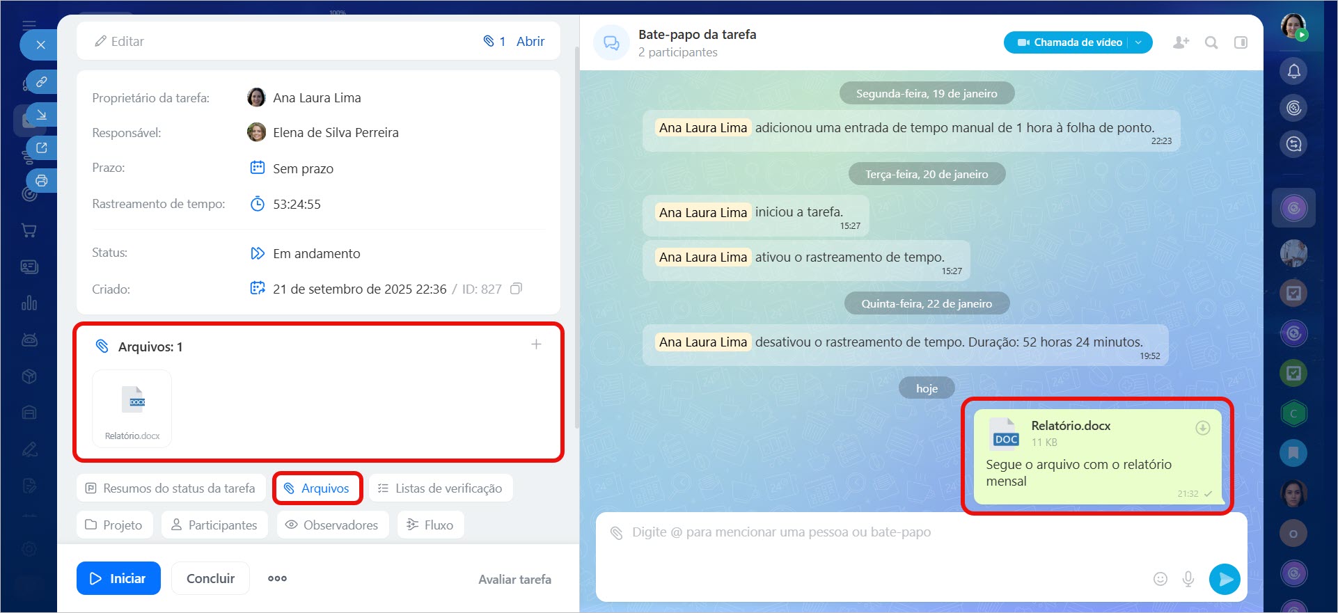 Em uma tarefa, você pode armazenar todos os materiais relacionados a ela: layouts, instruções, documentos e outros arquivos. Por exemplo, na tarefa "Verificar contrato", o colaborador anexa o documento e os colegas o abrem diretamente no cartão. Assim, a equipe trabalha com a versão mais atual, sem trocas de mensagens e reenvios. Se precisar discutir algo rapidamente — você pode enviar o arquivo diretamente no Bate-papo da tarefa.