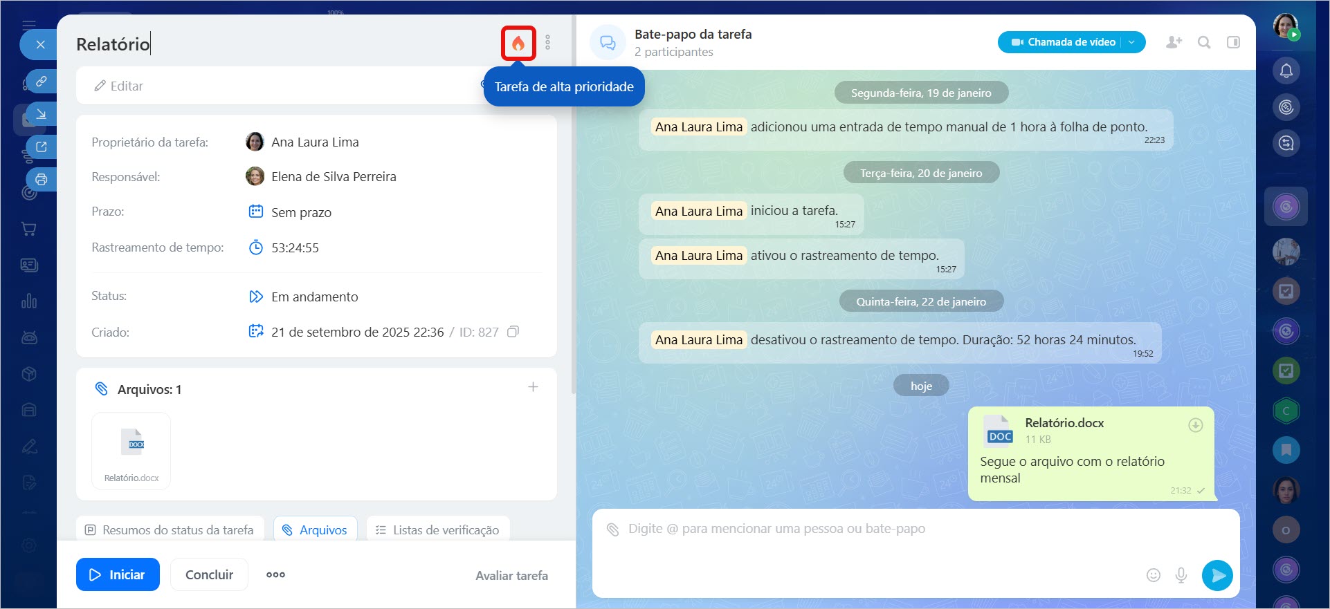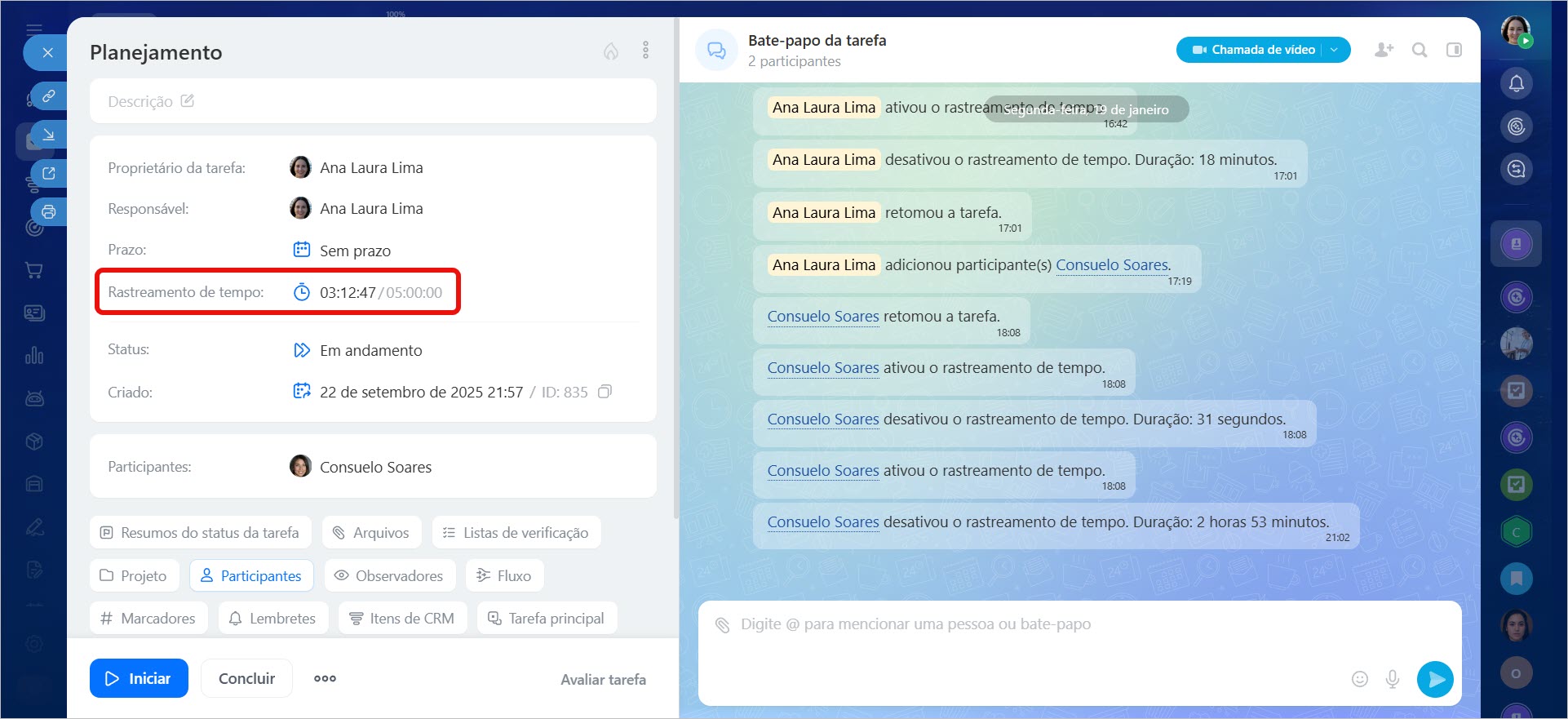 Todos os dados são salvos automaticamente no cartão da tarefa. Os Participantes não precisam fazer o controle manualmente, e fica mais fácil para o criador da tarefa ver quanto tempo a equipe está dedicando à tarefa e avaliar a contribuição de cada Participante.
