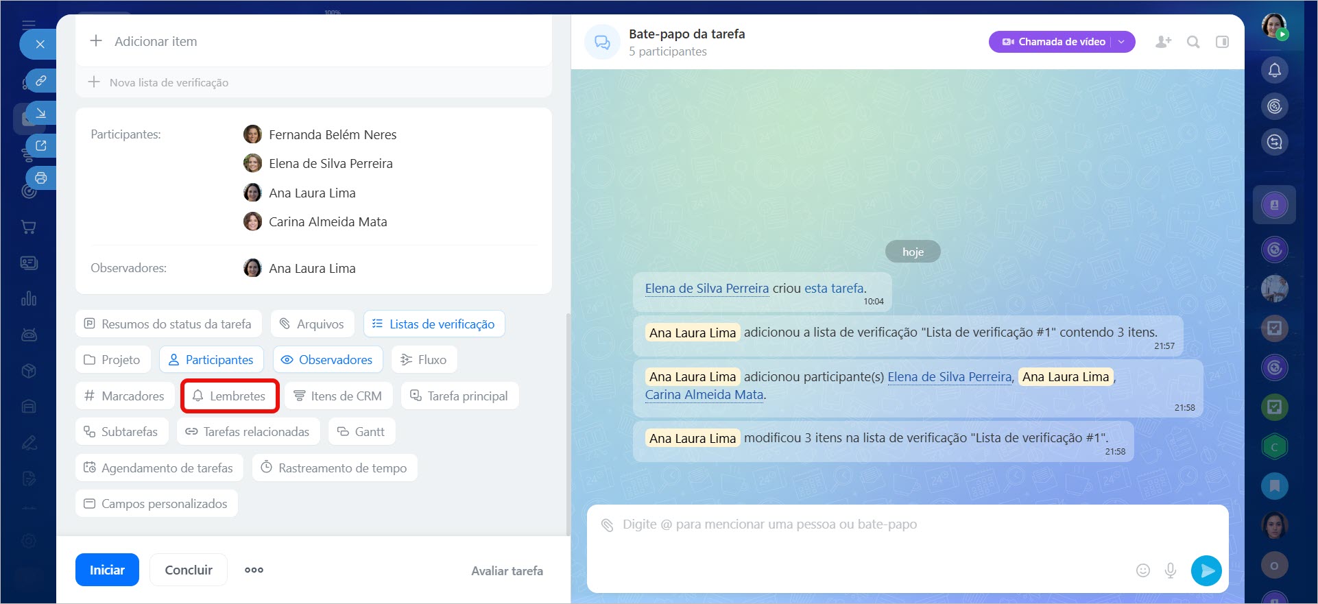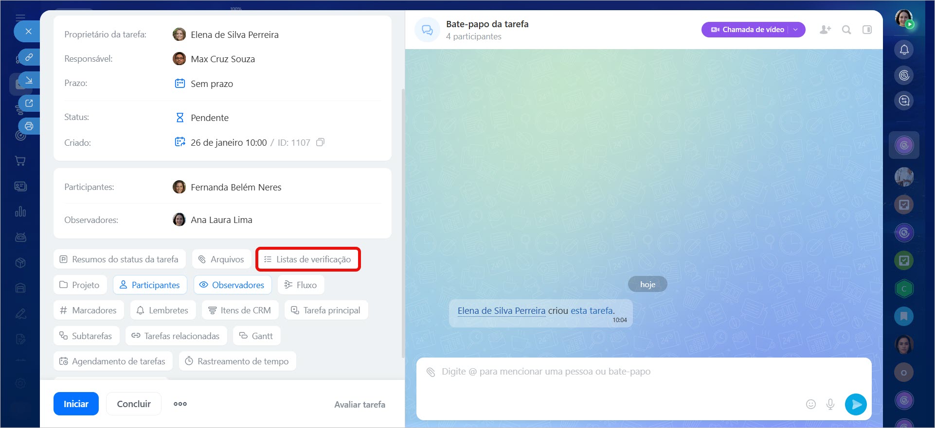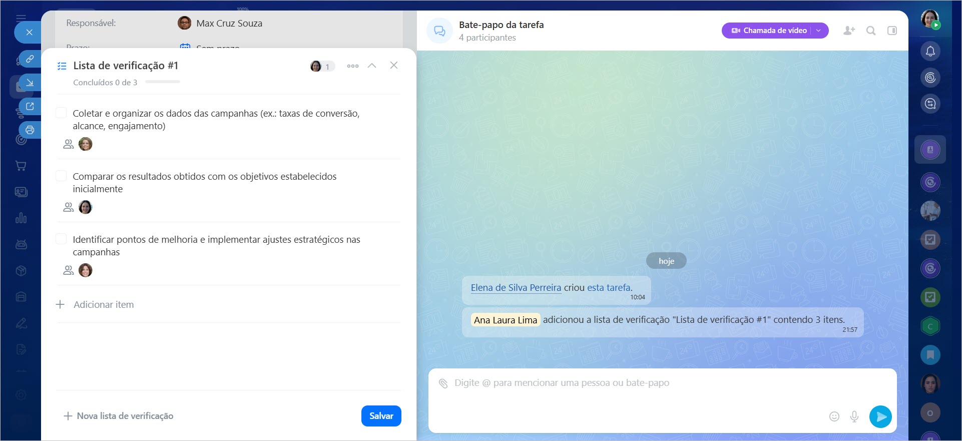 Por exemplo, ao preparar uma campanha publicitária, você pode criar uma tarefa, especificar a descrição e os prazos, anexar os materiais necessários e adicionar uma checklist. Assim, a equipe verá o plano de trabalho e poderá acompanhar o progresso de cada item.