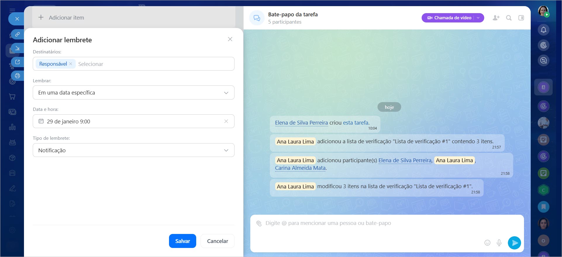 Os lembretes ajudam a não perder etapas importantes do trabalho e a cumprir os prazos. Eles podem ser configurados para cada Participante. Para o Responsável, o lembrete indicará quando começar a trabalhar ou retornar à tarefa, e para o criador da tarefa — quando verificar o resultado.