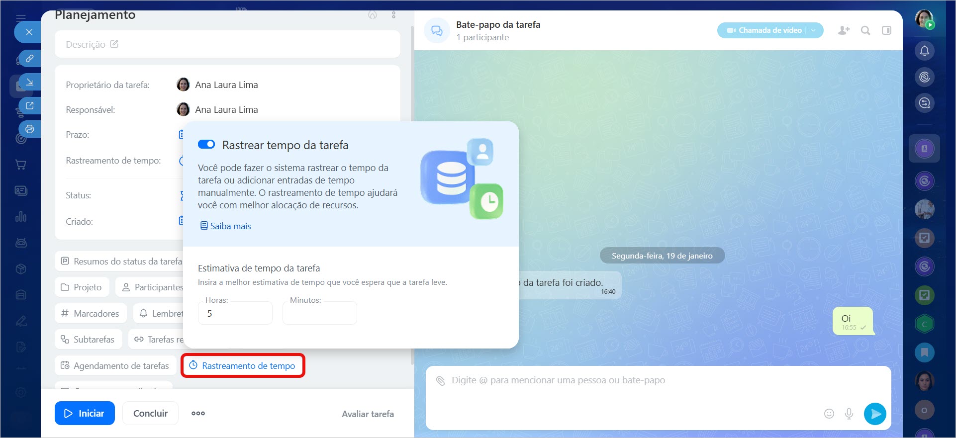 Clique em Controle de tempo e especifique por quanto tempo a tarefa deve ser executada. Assim, será mais fácil para o Responsável planejar o trabalho e para o criador da tarefa — comparar o planejado com o realizado.