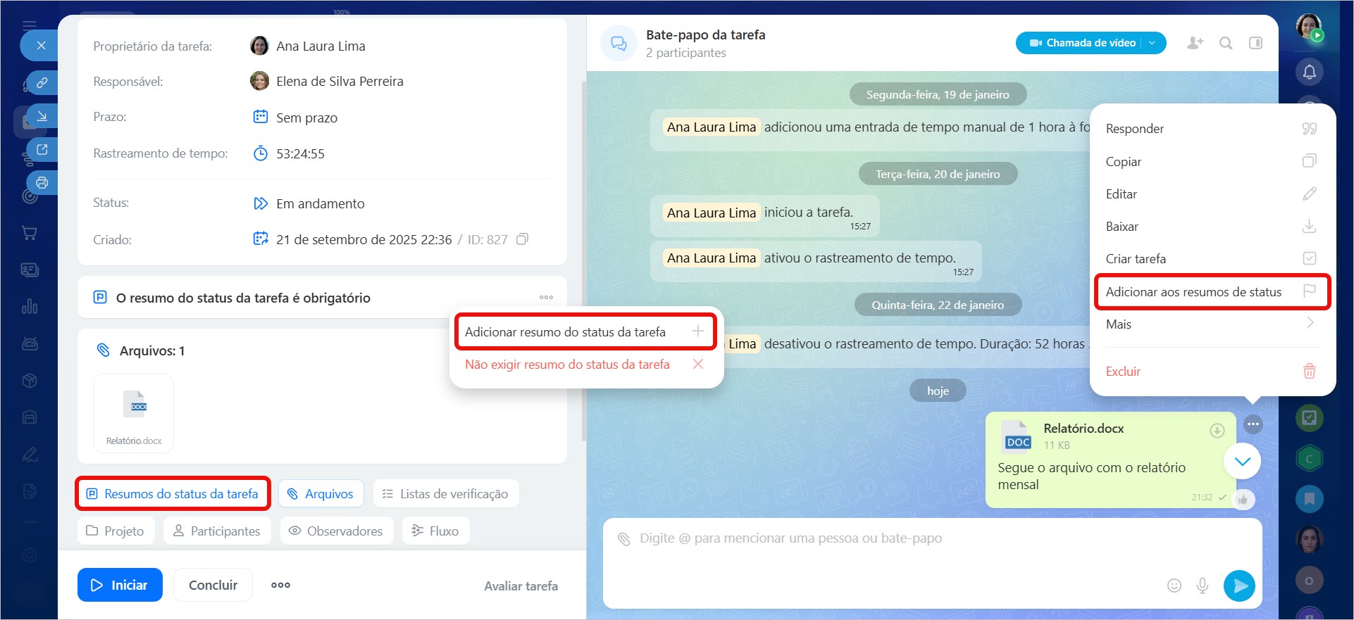 Nos resultados, você pode registrar não apenas o resultado final, mas também marcos intermediários importantes. O resultado pode ser adicionado no bloco "Resultado" ou enviado como mensagem no Bate-papo e marcado como resultado.