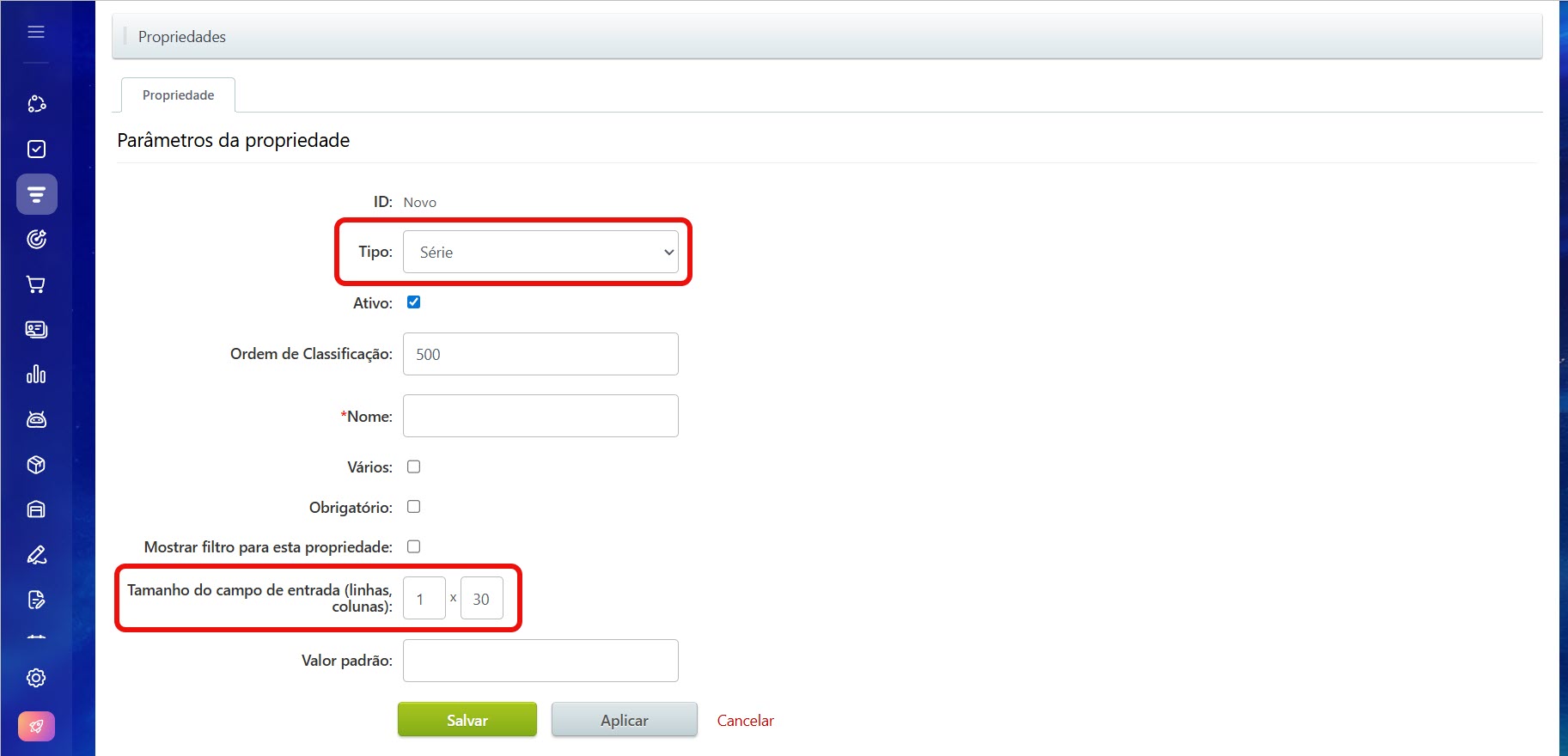 • Ordem de classificação – determina em qual posição da lista a propriedade será exibida. Quanto menor o número, mais alta ela ficará. Por exemplo, a propriedade Material com o valor 100 será exibida acima de Código com o valor 200.