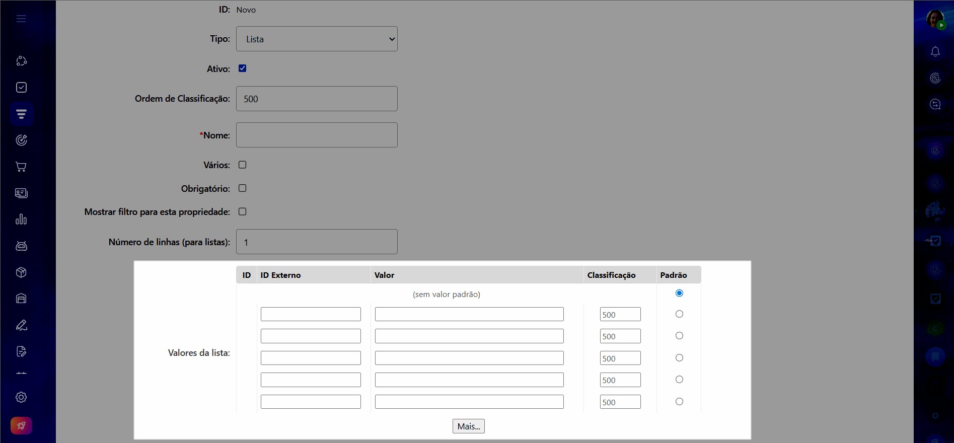 • Classificação – determina em qual posição da lista a opção será exibida. Quanto menor o valor, mais alta ela ficará.