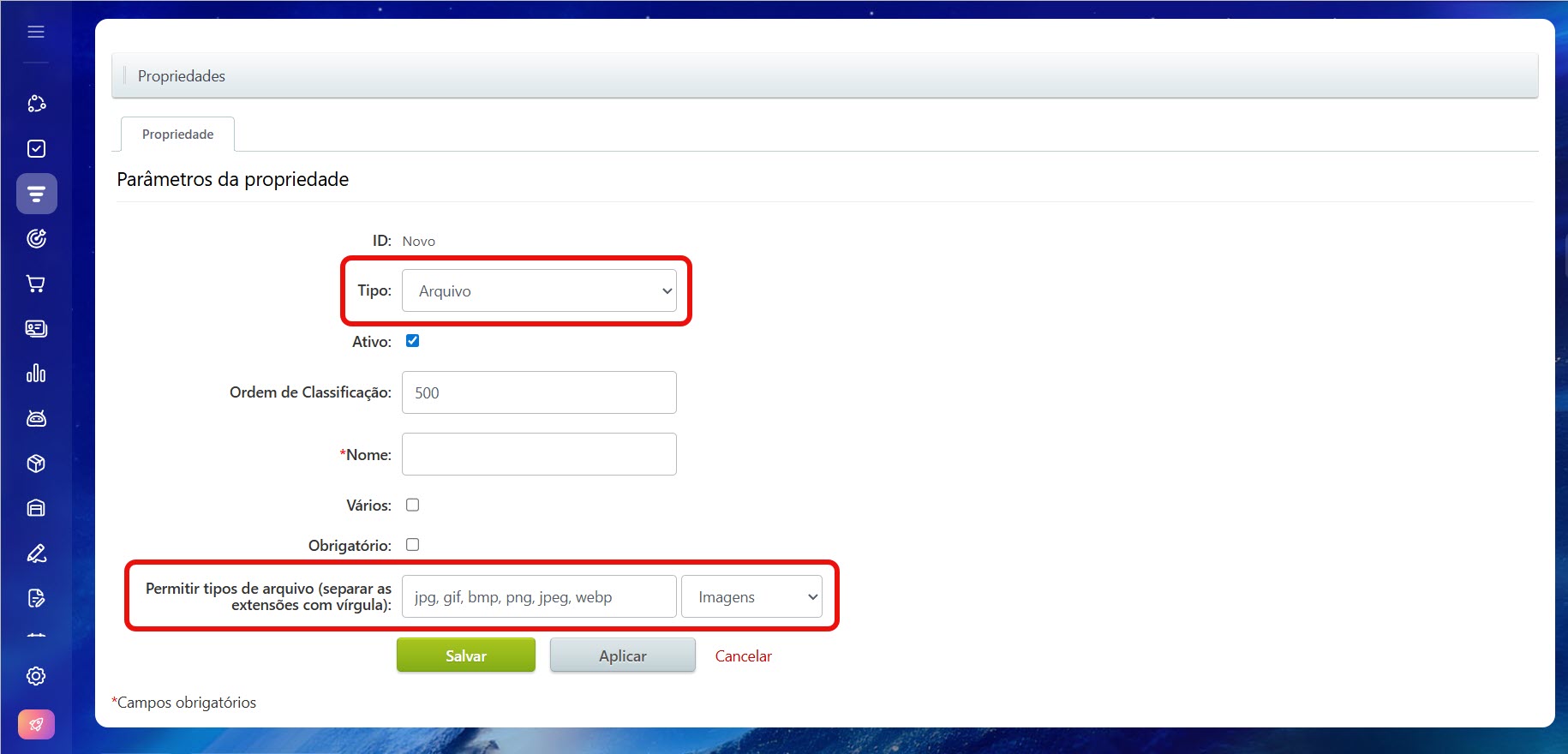Arquivo. No campo Tipos de arquivos para carregar (extensões separadas por vírgula), especifique quais formatos de arquivo podem ser anexados ao cartão do produto ou serviço, por exemplo: pdf, docx, jpg. Para adicionar automaticamente as extensões permitidas, selecione uma categoria, por exemplo, Imagens.