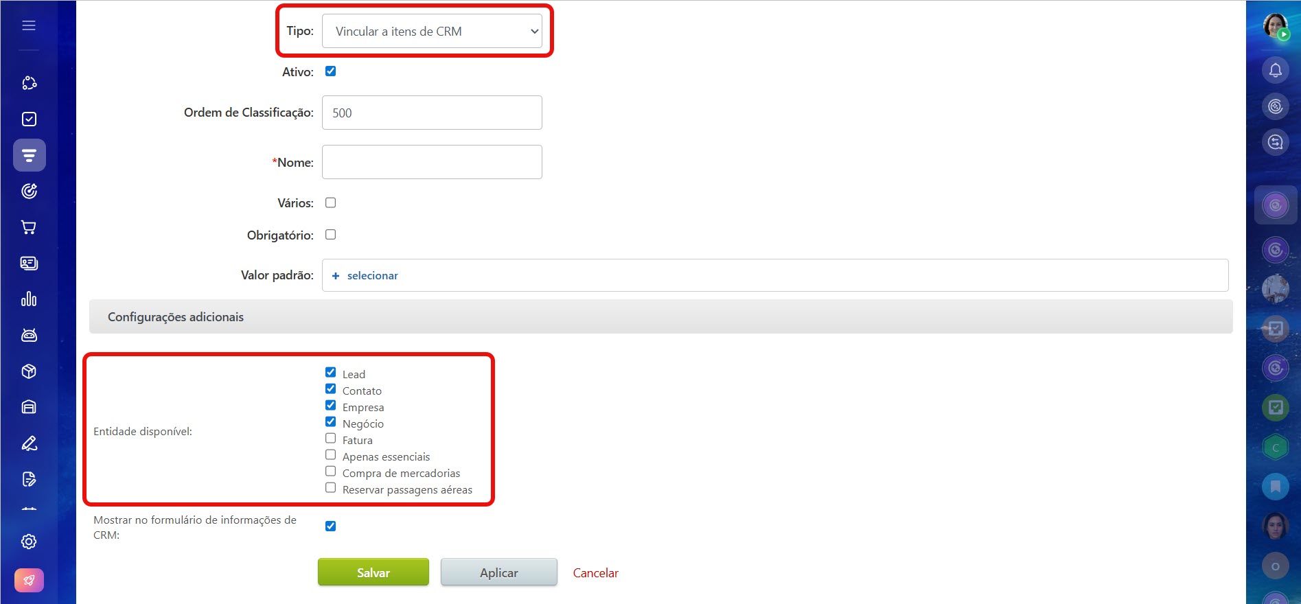 Vínculo com elementos do CRM. A opção Elemento disponível determina com quais elementos do CRM o produto ou serviço pode ser vinculado e acessados rapidamente a partir do cartão.