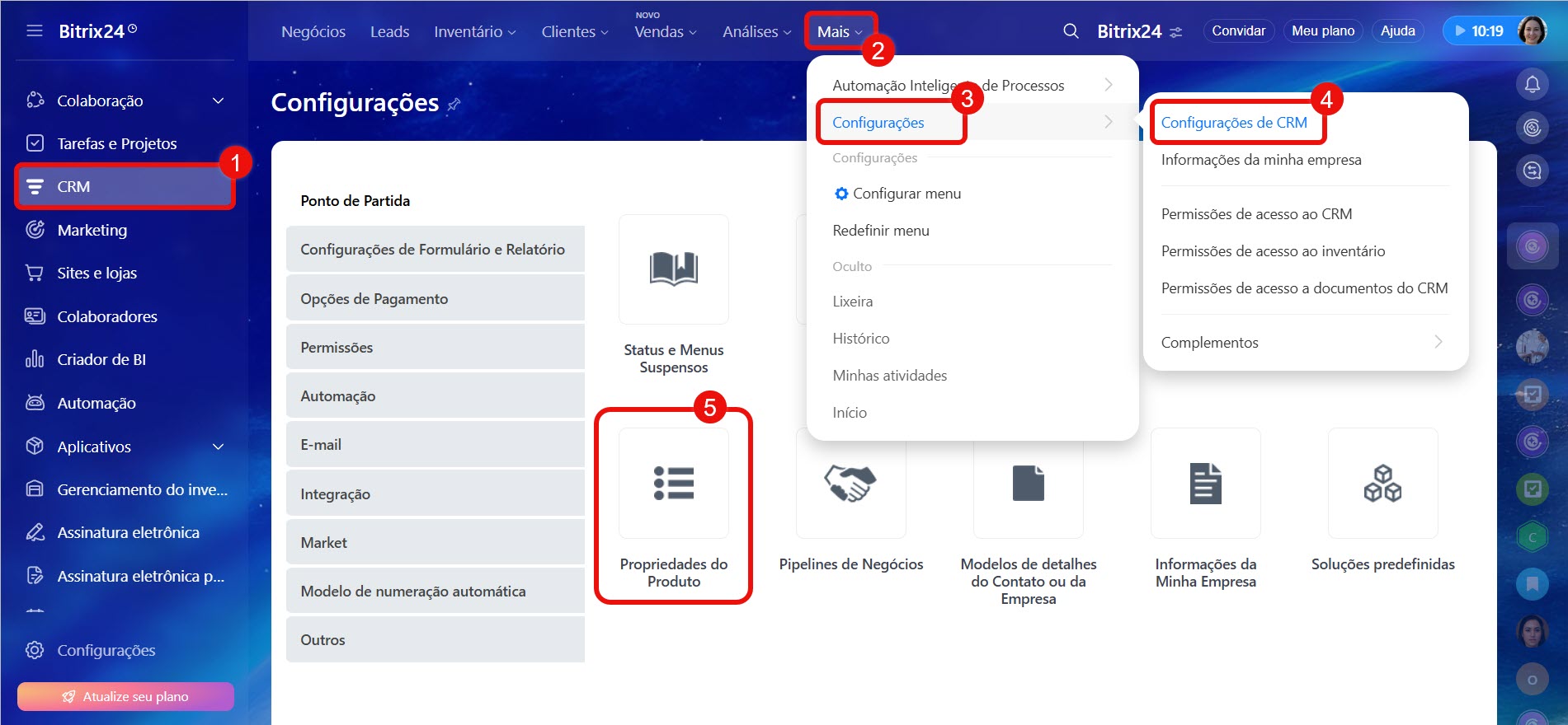 1–5. Acesse CRM > Mais > Configurações > Configurações do CRM > Propriedades dos produtos.