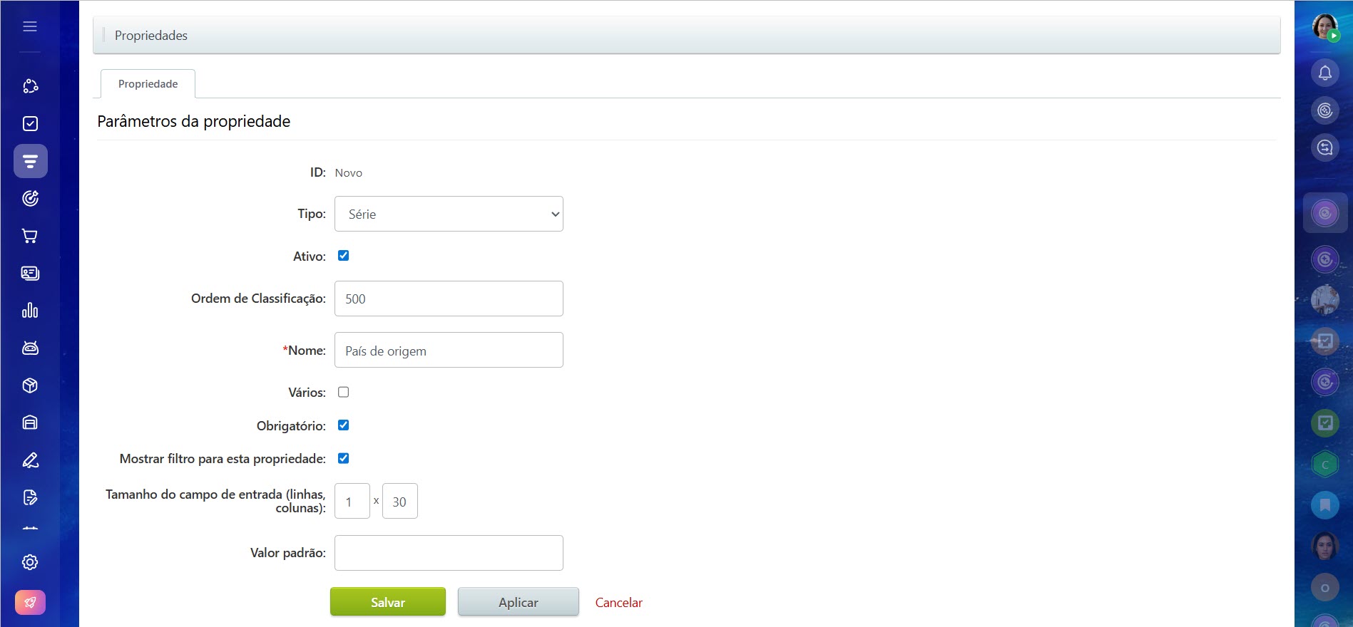 • As configurações da propriedade podem ser alteradas no cartão do produto ou nas configurações do CRM. Ela só pode ser excluída nas configurações do CRM.