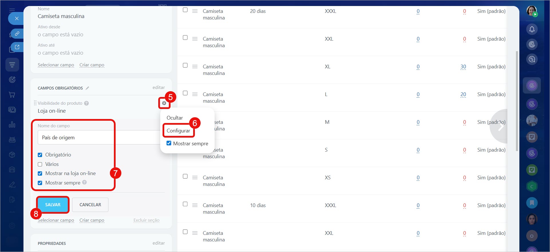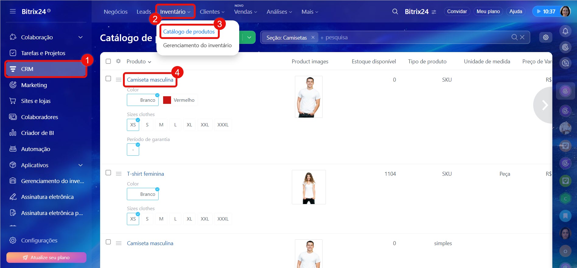 1–3. Acesse CRM > Produtos e Depósitos > Catálogo de produtos.