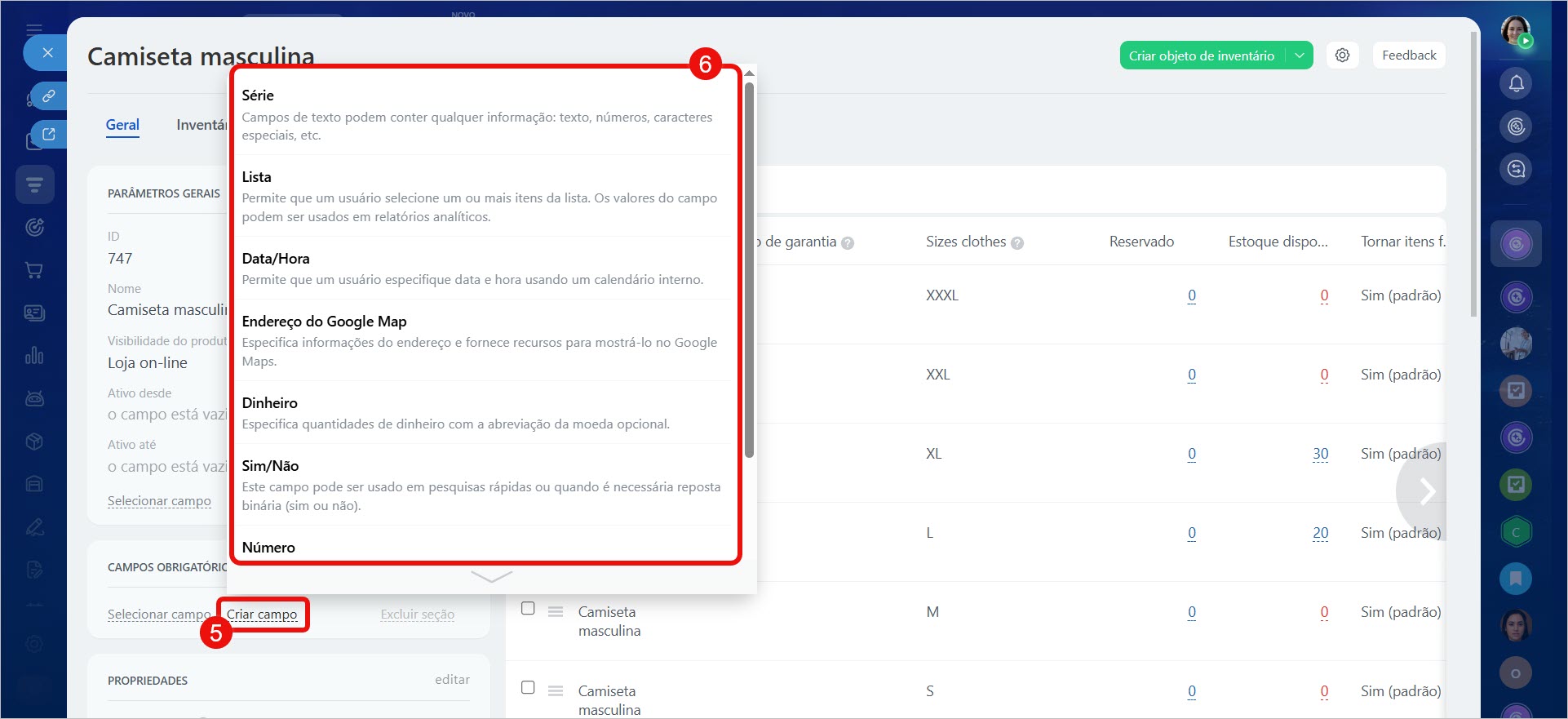 4–6. Abra o cartão do produto, clique em Criar campo e selecione seu tipo.